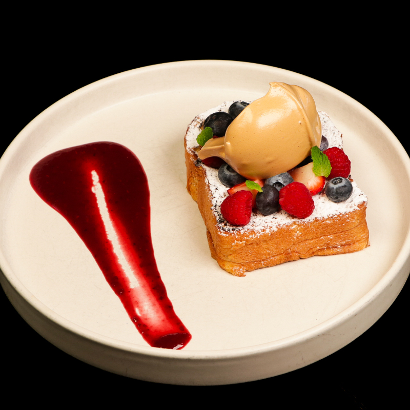 ESPONJOSO PAN BRIOCHE CON IX DE FRUTOS ROJOS, ESPUMA DE CAFE, COMPOTE DE FRUTOS ROJOS Y ESPOLVOREADO DE AZUCAR GLASS.