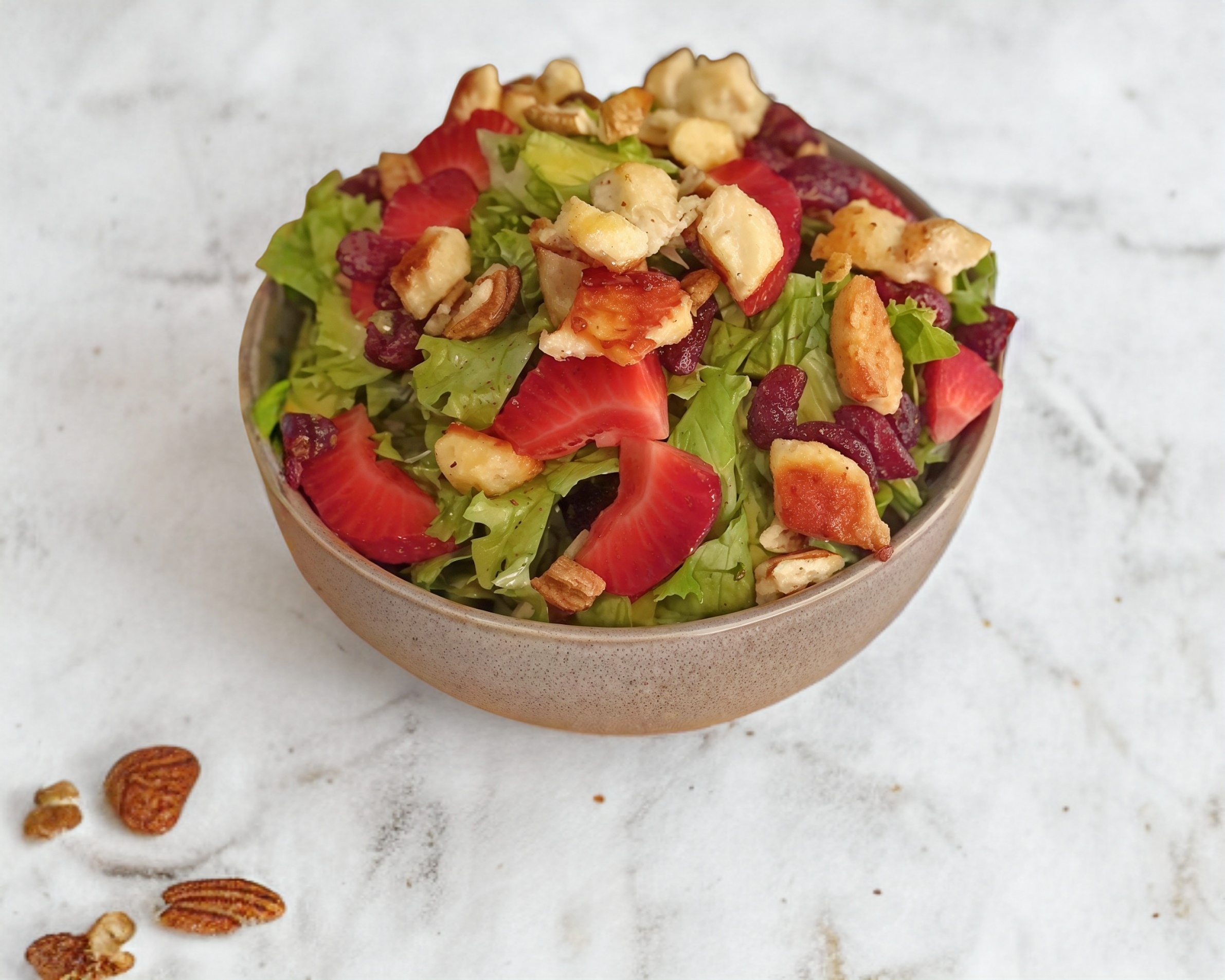 Mix de lechuga,fresa,nuez, arándano,pollo, vinagreta de durazno (200gr)