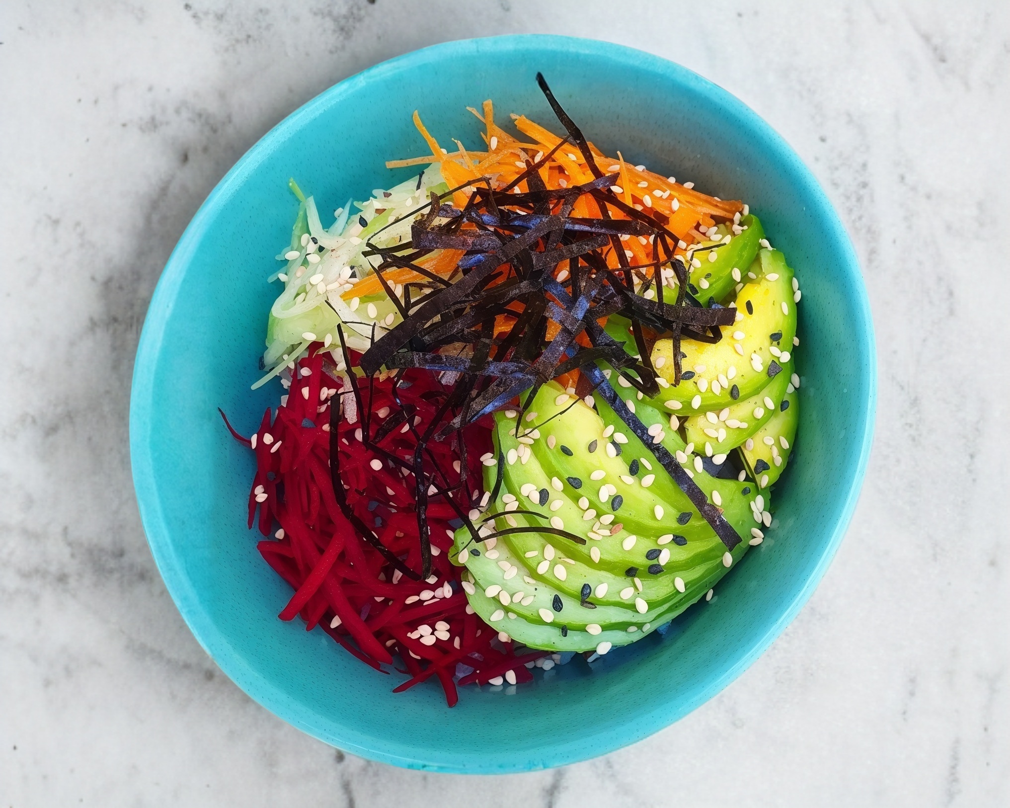Zanahoria, pepino, betabel, aguacate, alga, cebollin, ajonjoli, aderezo serranito, arroz gohan (250gr)