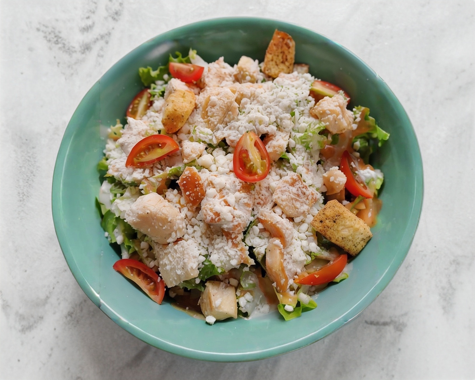 Lechuga romana, pechuga de pollo, crotones de queso y ajo, queso parmesano, aderezo cesar (200gr)