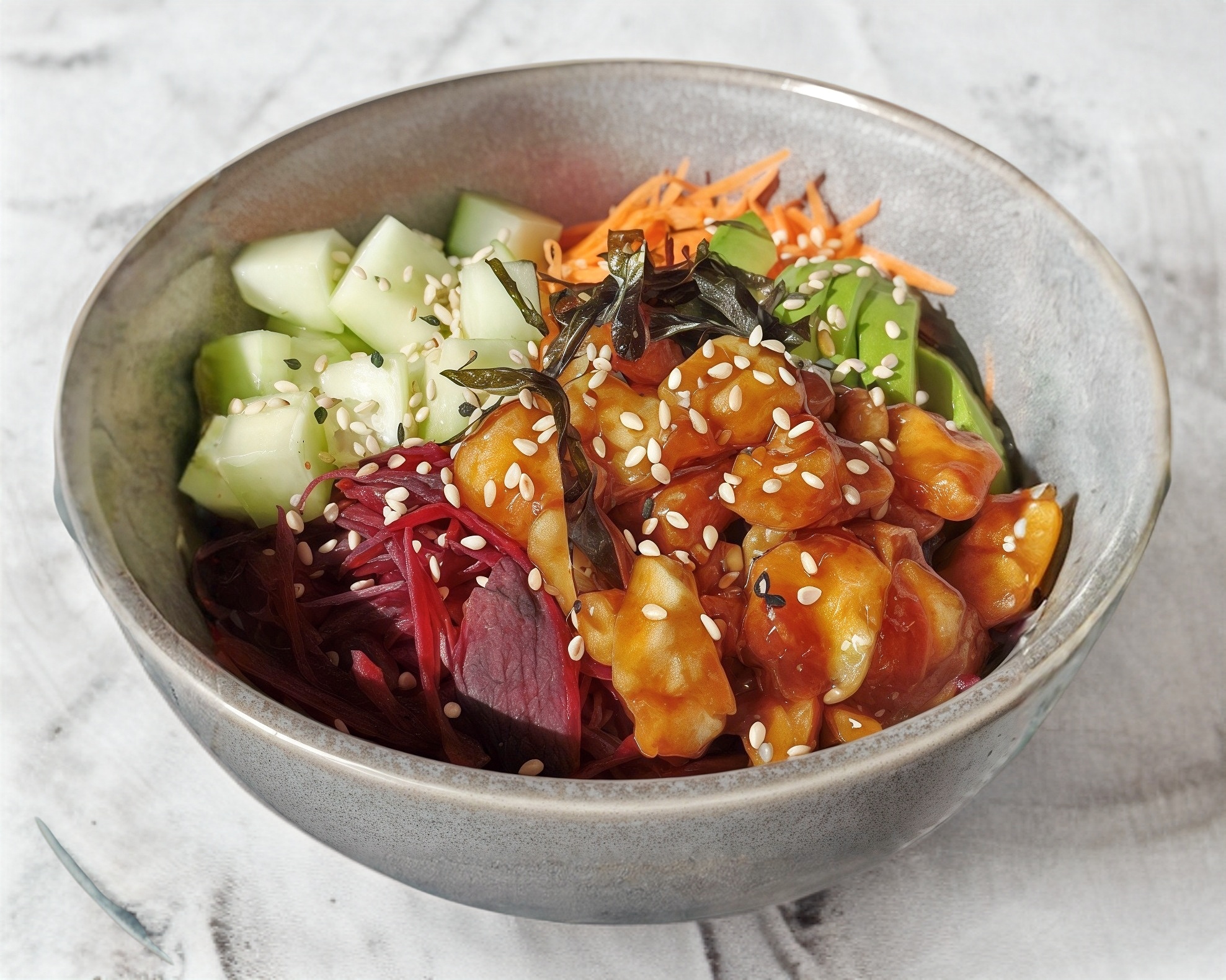 Zanahooria, pepino, betabel, aguacate, alga, cebollin, ajonjoli, pollo frito en trozos , aderezo teriyaki, arroz hohan (250gr)