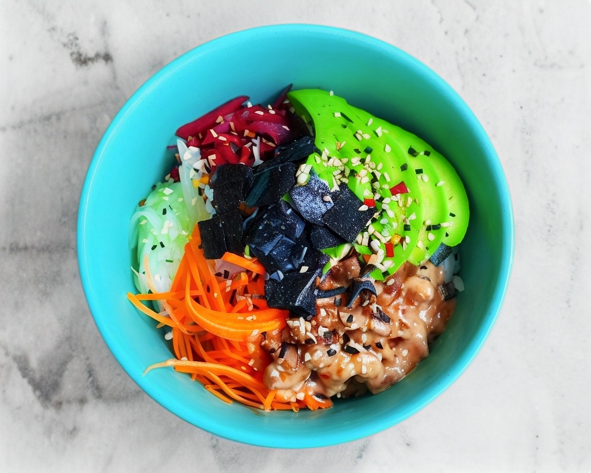 Arroz Gohan, zanahoria, betabel, pepino, aguacate,alga nori, ajonjoli, medallón de atún crudo marinado en aderezo spicy (250gr)
