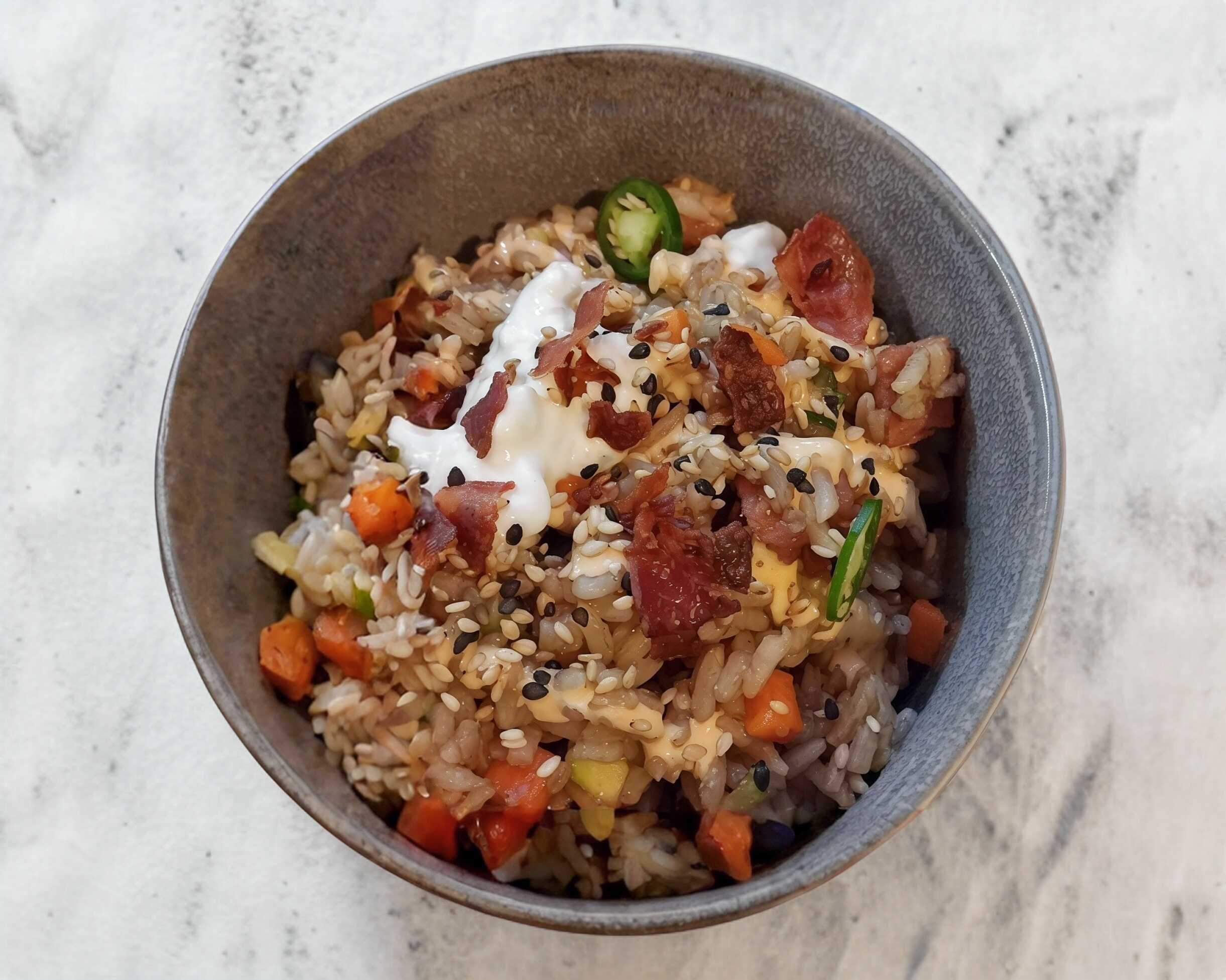 Arroz Gohan, zanahoria, calabacita,salsa de soya,chuleta de puerco ahumada picante,ajonjoli, Tampico, aderezo chipotle (250gr)