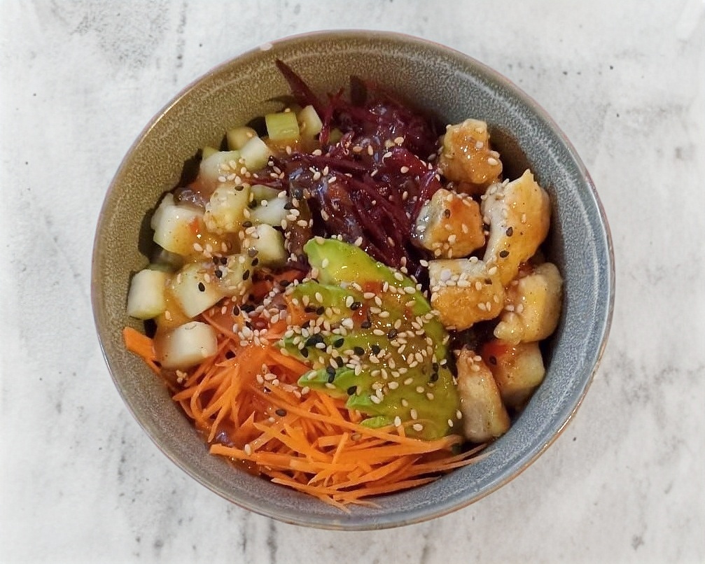 Arroz Gohan,zanahoria,betabel,pepino, aguacate,alga nori, ajonjolí,pollo frito,aderezo de miel picante (250gr)