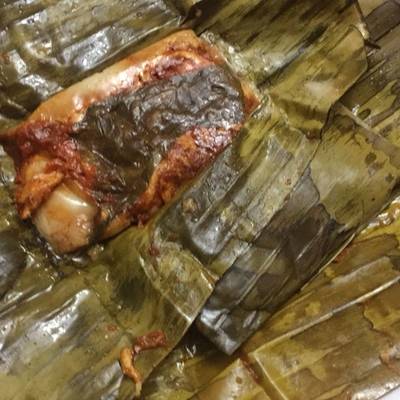 Tamal envuelto en hoja de plátano, salsa roja y pollo