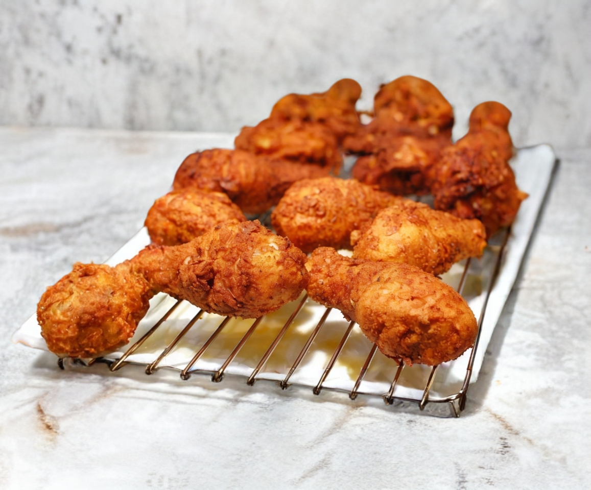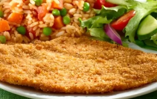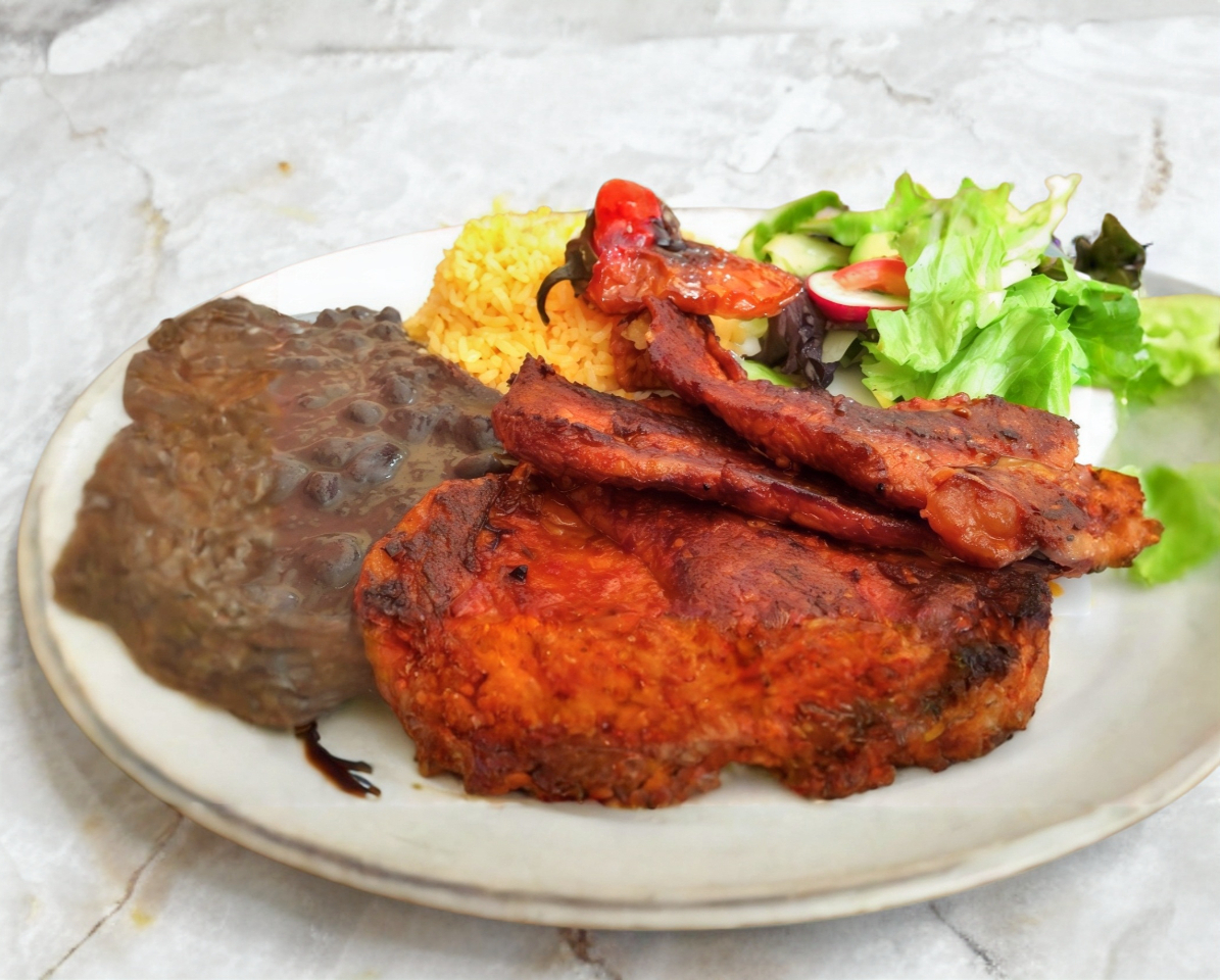 Pierna y muslo frito, acompañado de papas, frijoles y tortillas.