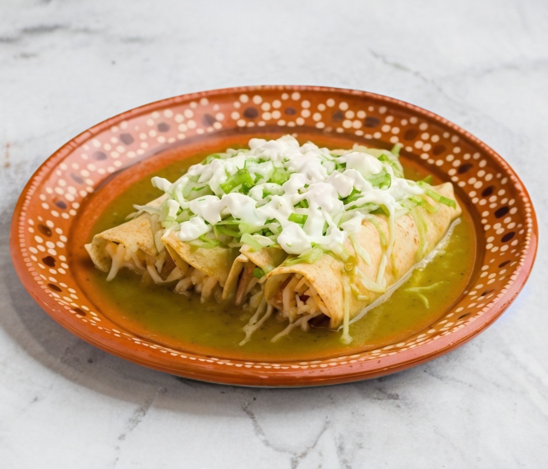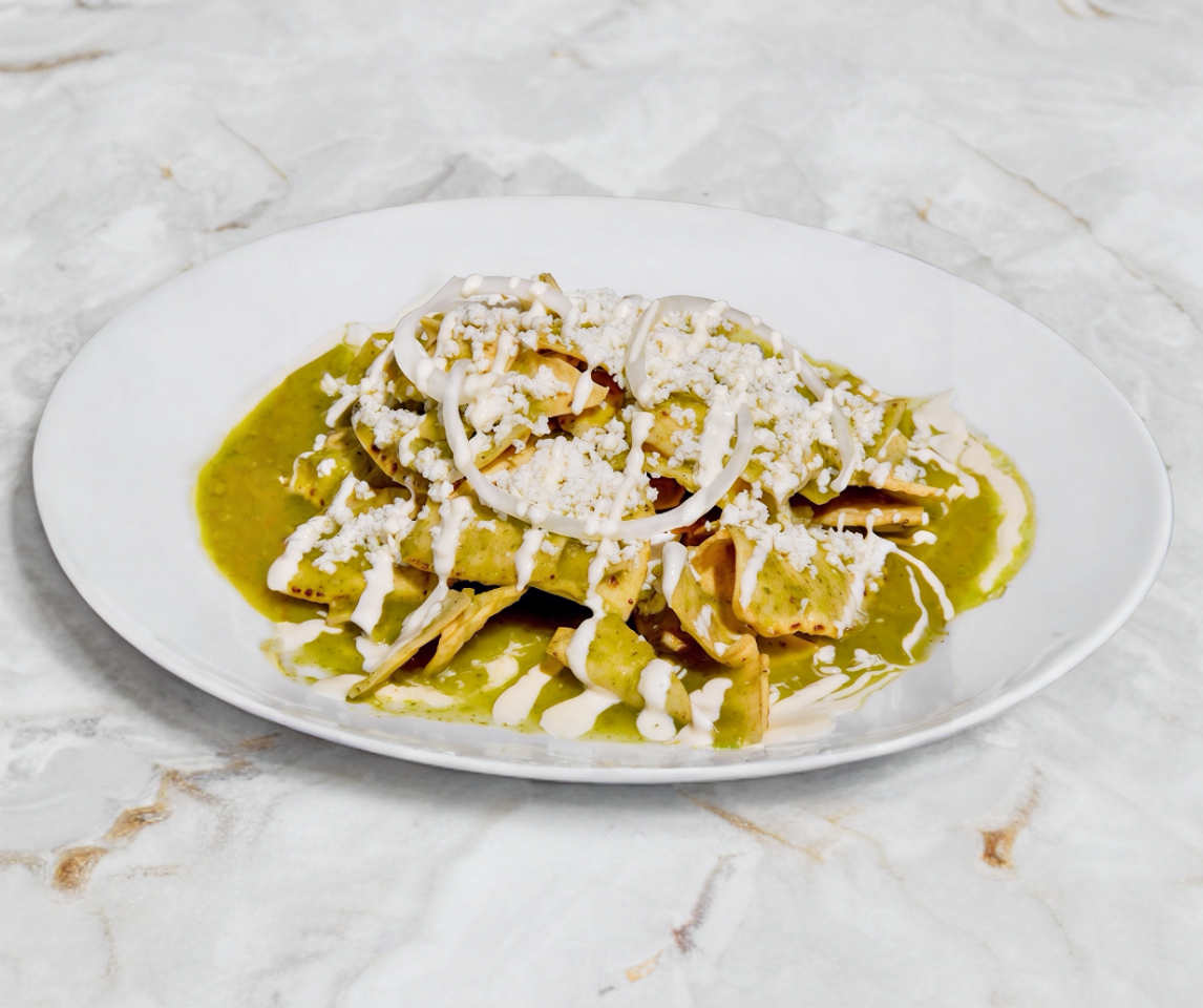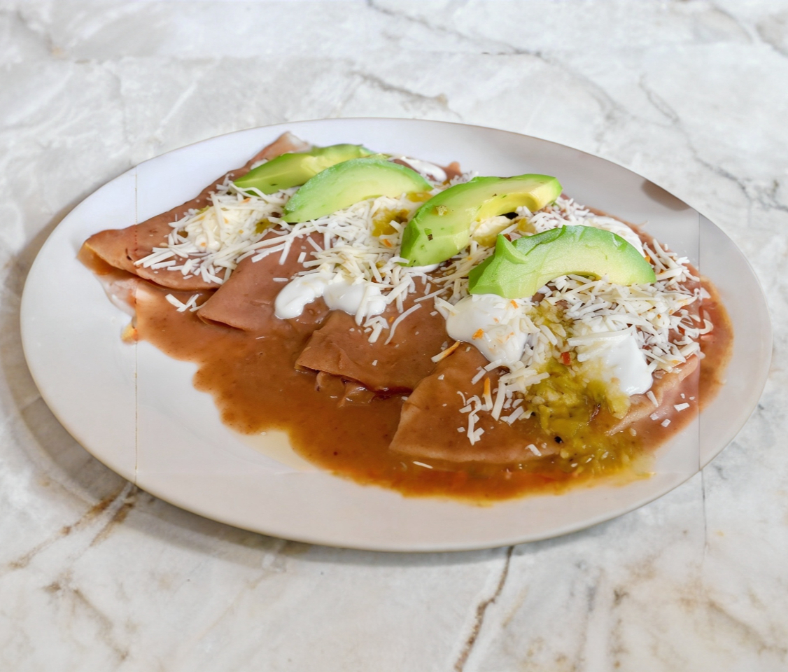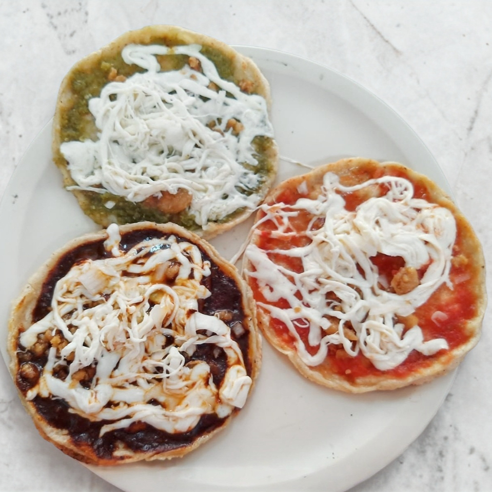 Tortilla de maíz con salsa de su preferencia, cebolla y queso.