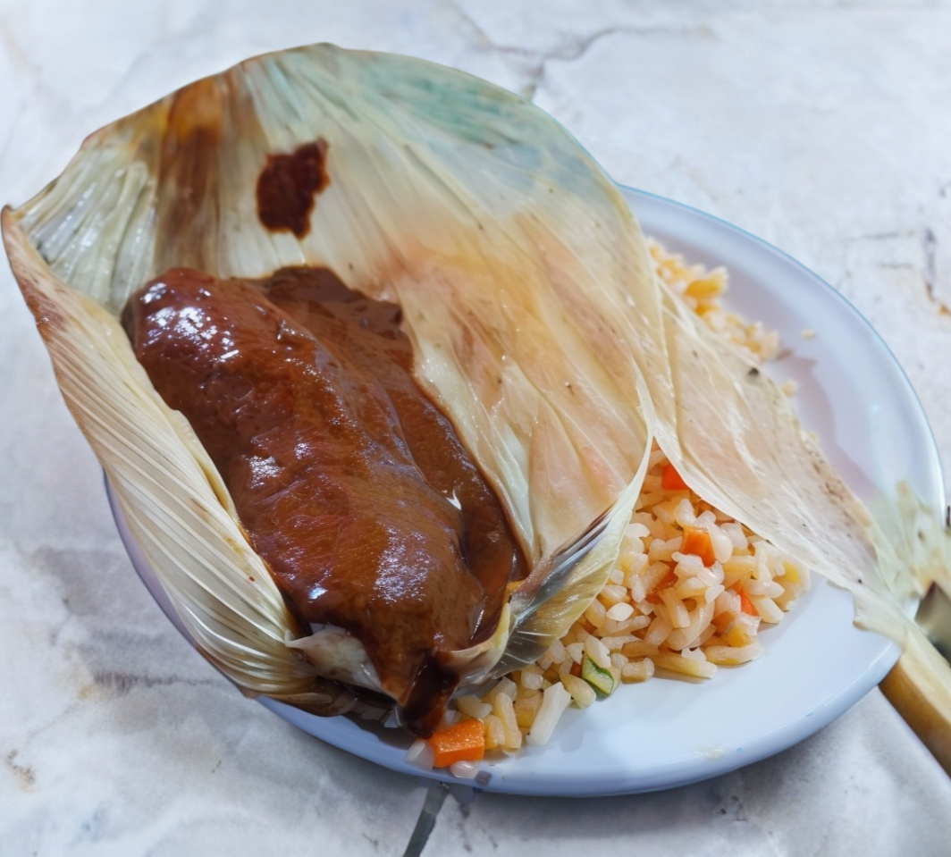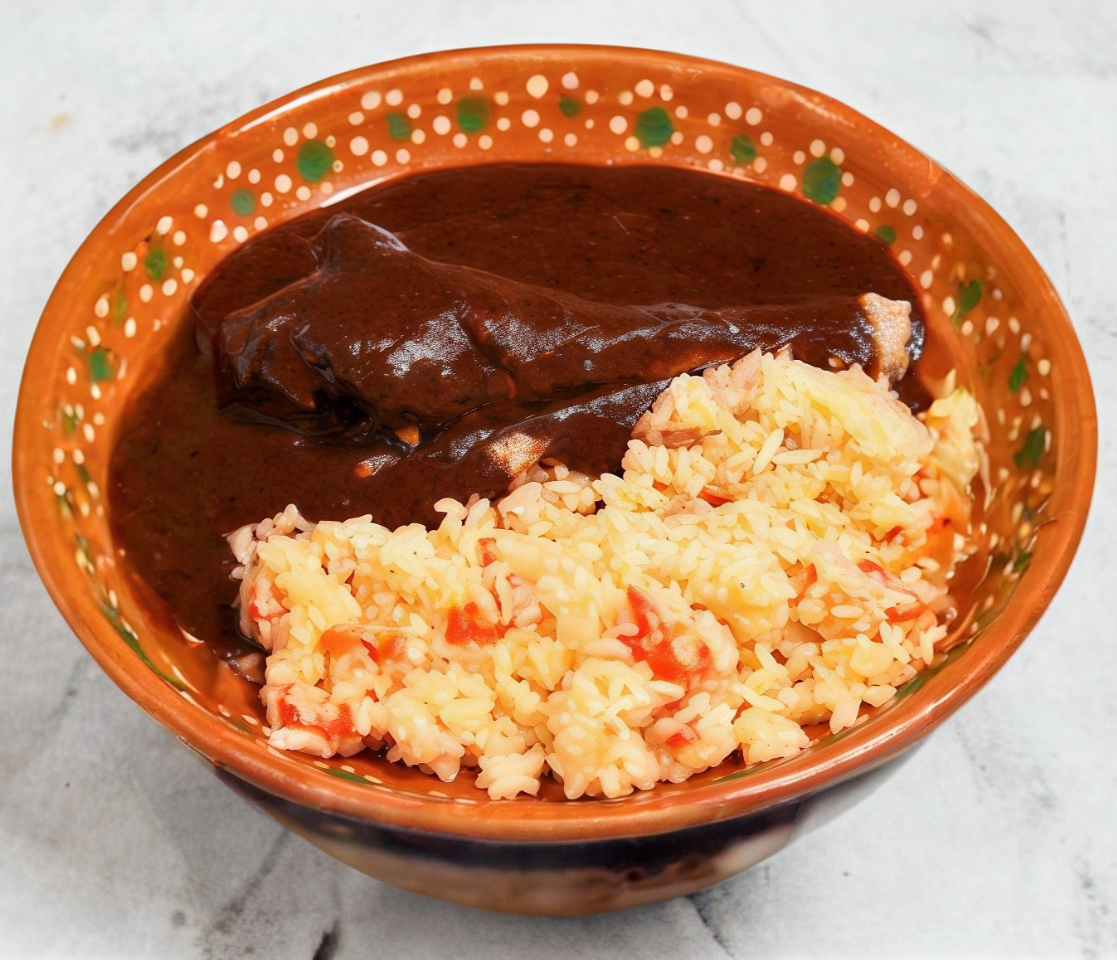 Orden de mole poblano con pollo y arroz incluye tortillas