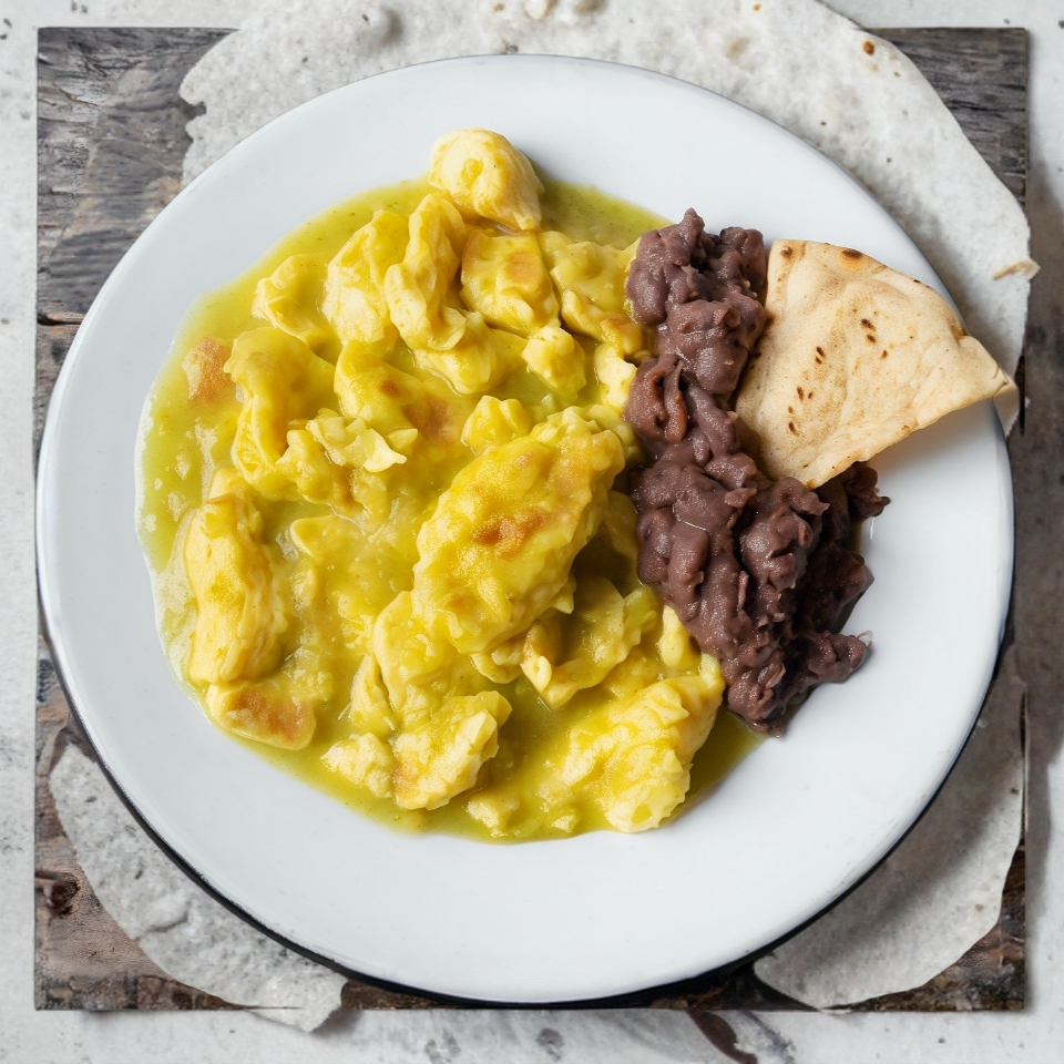Huevo revuelto 2 piezas con salsa a su elección, acompañado de frijoles y tortillas