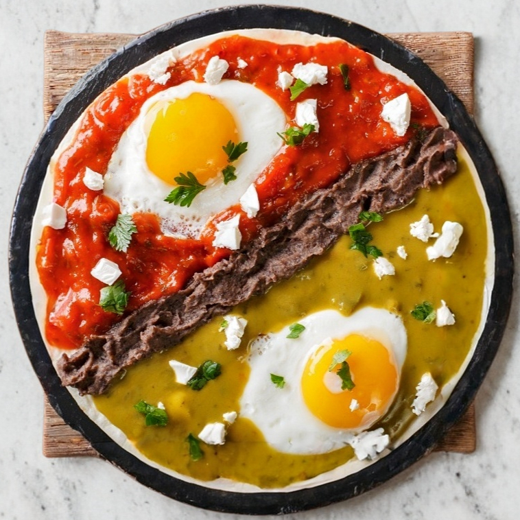 2 Piezas de huevos estrellados, bañado con salsa verde y roja y frijoles refritos enmedio