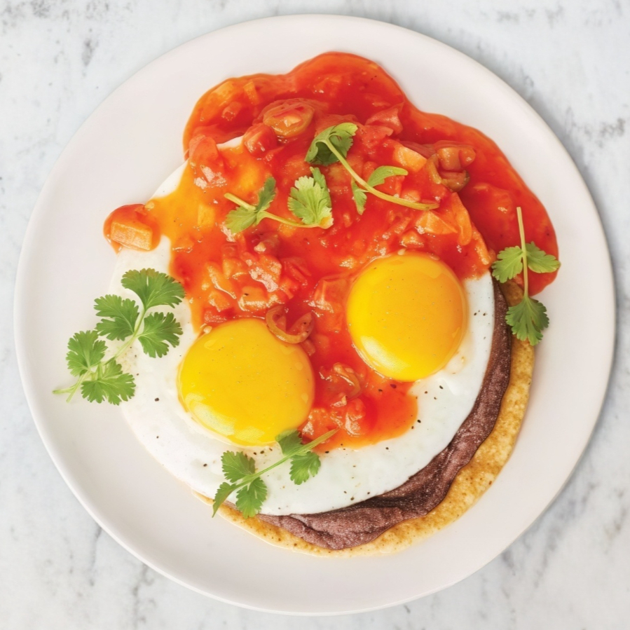 2 Piezas de huevo estrellado con tortilla abajo, bañados en tu salsa de elección.