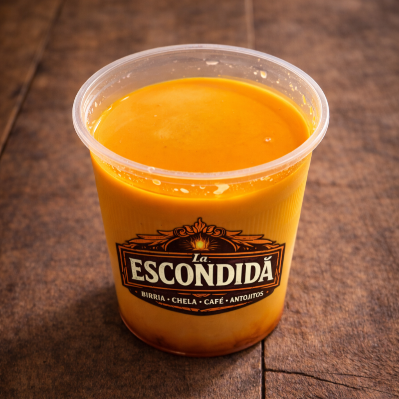 500 ml de consomé de birria bien calientito y lleno de sabor. Se acompaña con cilantro y cebolla fresca, limón y salsa para darle ese toque picosito que lo hace irresistible. no incluye tortilla.