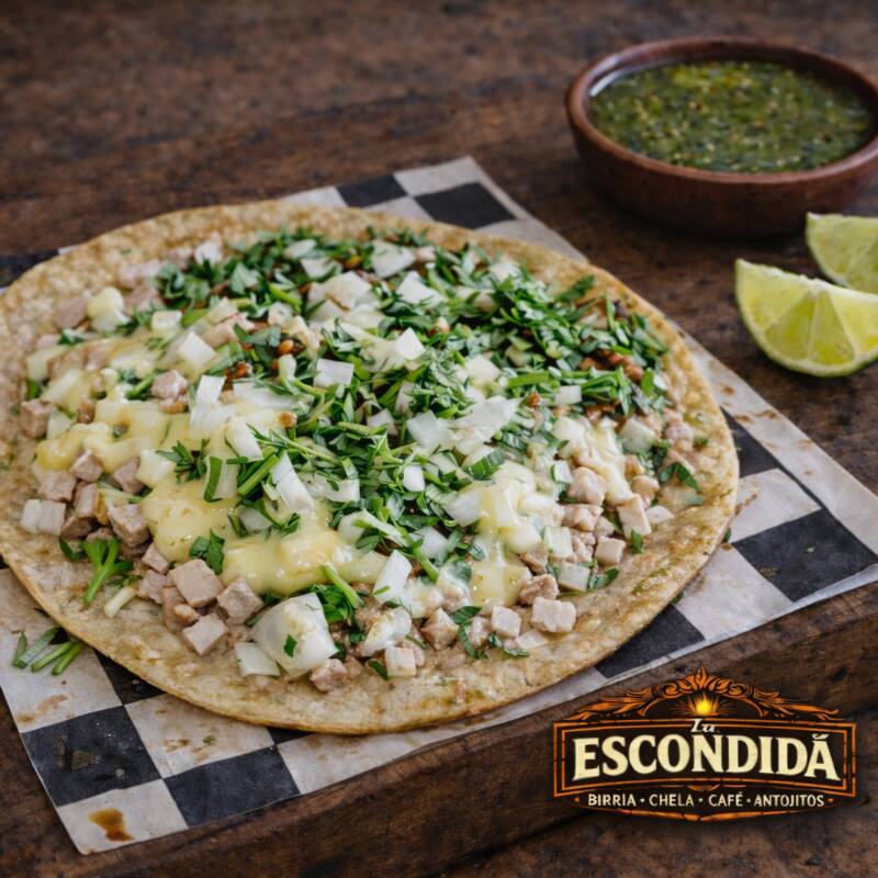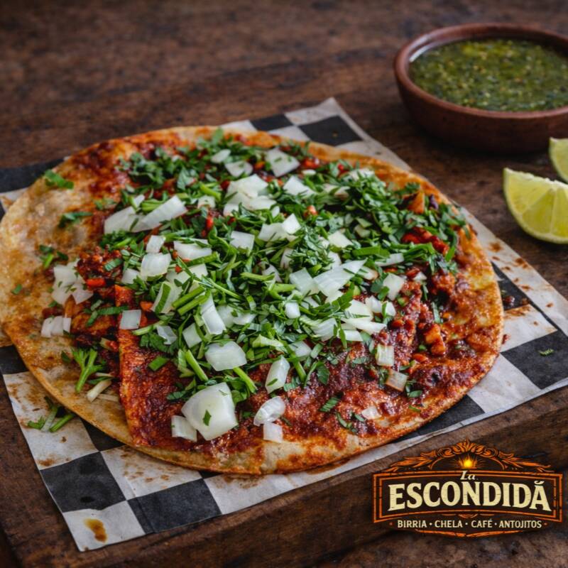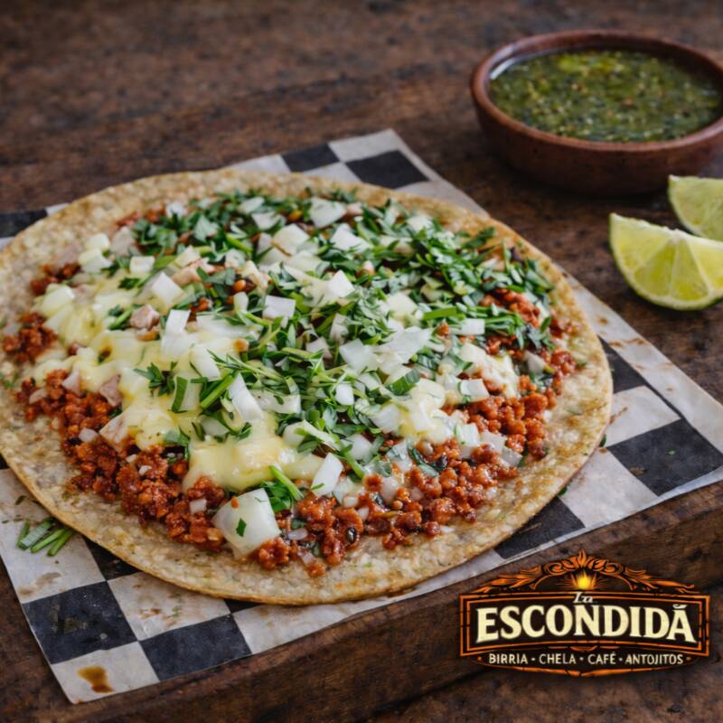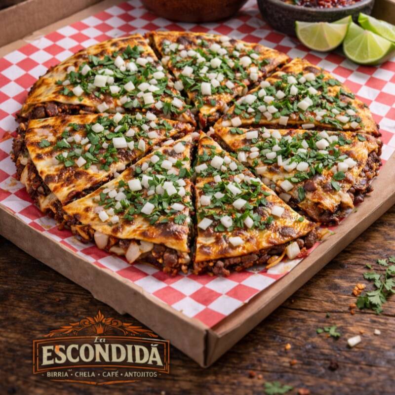 Elaborada con triple tortilla de harina tamaño regular, en dos pisos tipo pizza, rellena de birria de res jugosa y 6 rebanadas de queso manchego gratinado, con salsa de tomate estilo pizza en cada capa. Lleva cilantro y cebolla. Se acompaña de limón y salsa roja picosita. (PONER EN COEMTARIOS SI LA QUIEREN NATURAL)
