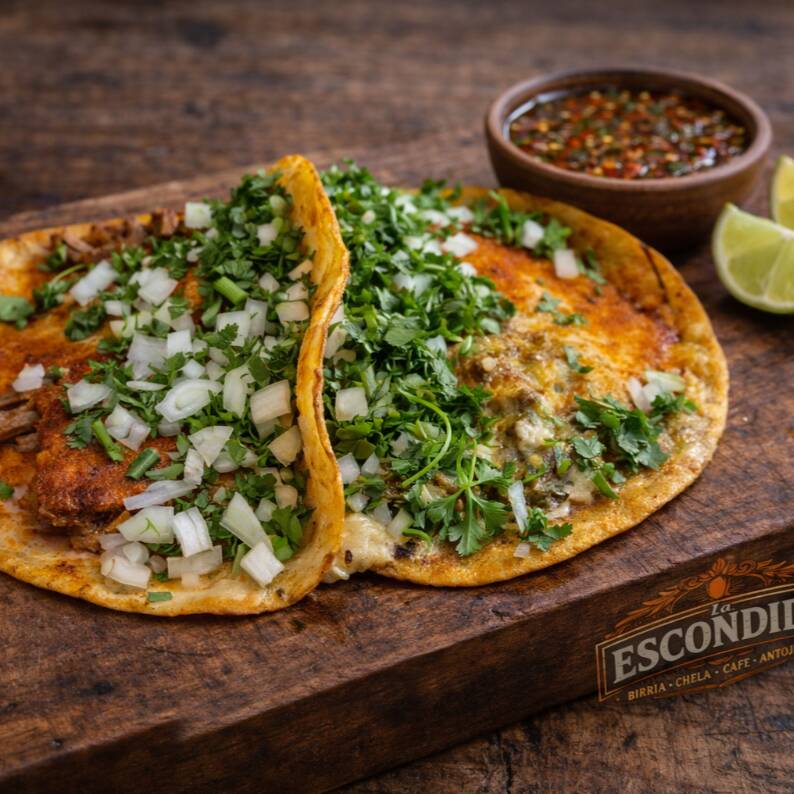 Orden de 2 quesabirrias preparadas con tortilla de harina, rellenas de queso manchego gratinado irresistible, acompañadas de cilantro y cebolla fresca. Se sirven con limón y salsa roja para resaltar todo su sabor. (PONER EN COMENTARIOS SI LA QUIERES NATURAL)