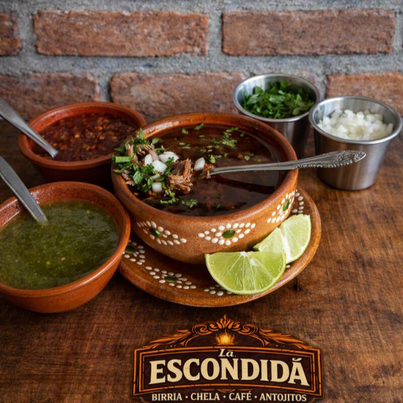 250 ml de consomé de birria bien calientito, servido con cilantro y cebolla fresca, limón y salsa roja para acompañar. No incluye carne ni tortillas.