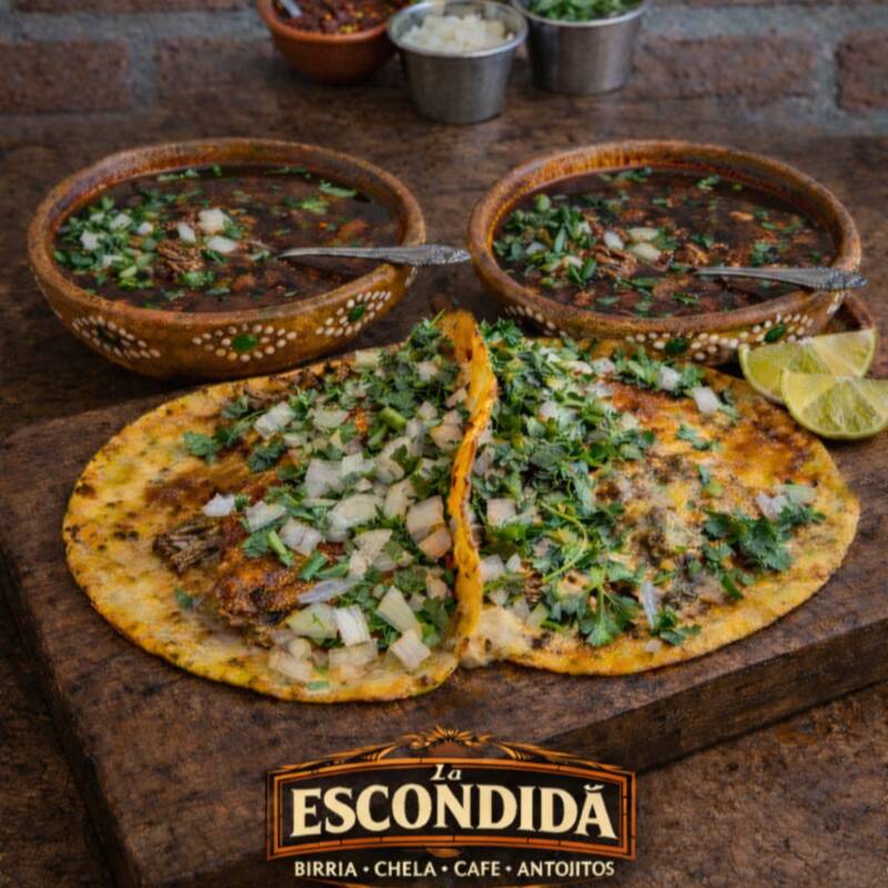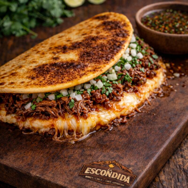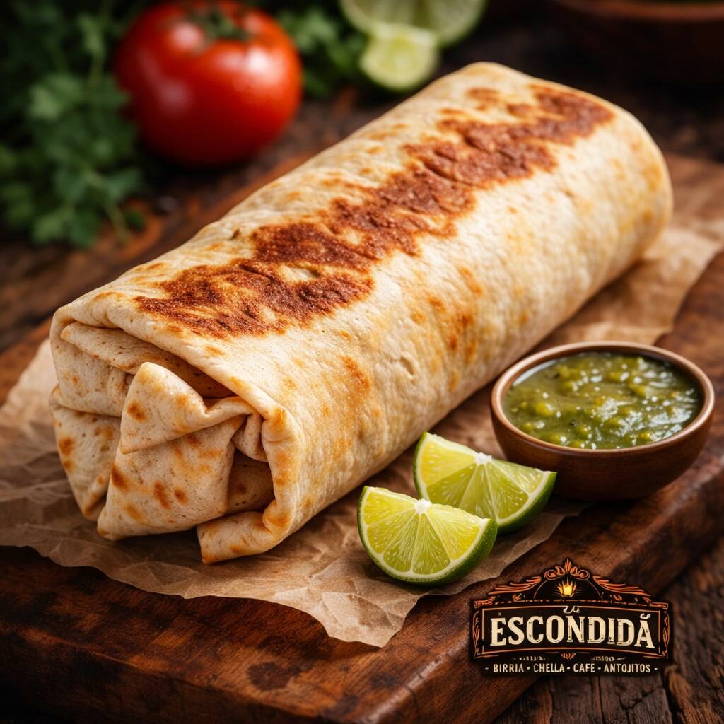 Preparada con tortilla burrera de harina de aproximadamente 30 cm, doradita a la plancha, rellena de queso derretido en abundancia y una generosa porción de birria suave y jugosa. Se acompaña de cilantro y cebolla fresca, limón y salsa roja para potenciar su sabor. De regalo incluye un consomé shopero, perfecto para acompañarla y disfrutarla al máximo.