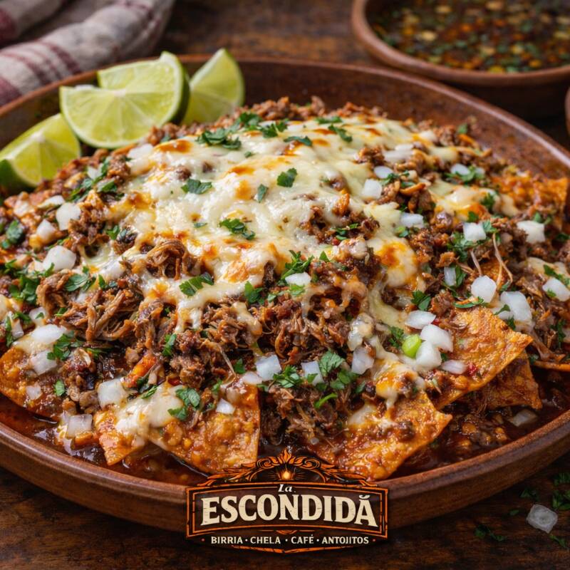 Chilaquiles de birria, preparados con totopos bañados en salsa roja hecha a base de consomé de birria, servidos con carne de birria jugosa, cilantro y cebolla picados, rodajas de cebolla, queso fresco y crema. Van coronados con queso manchego gratinado, acompañados de una porción de frijoles y totopos extra para disfrutar cada bocado. (PONER EN COMENTARIOS SI LOS LOS QUIEREN NATURALES)