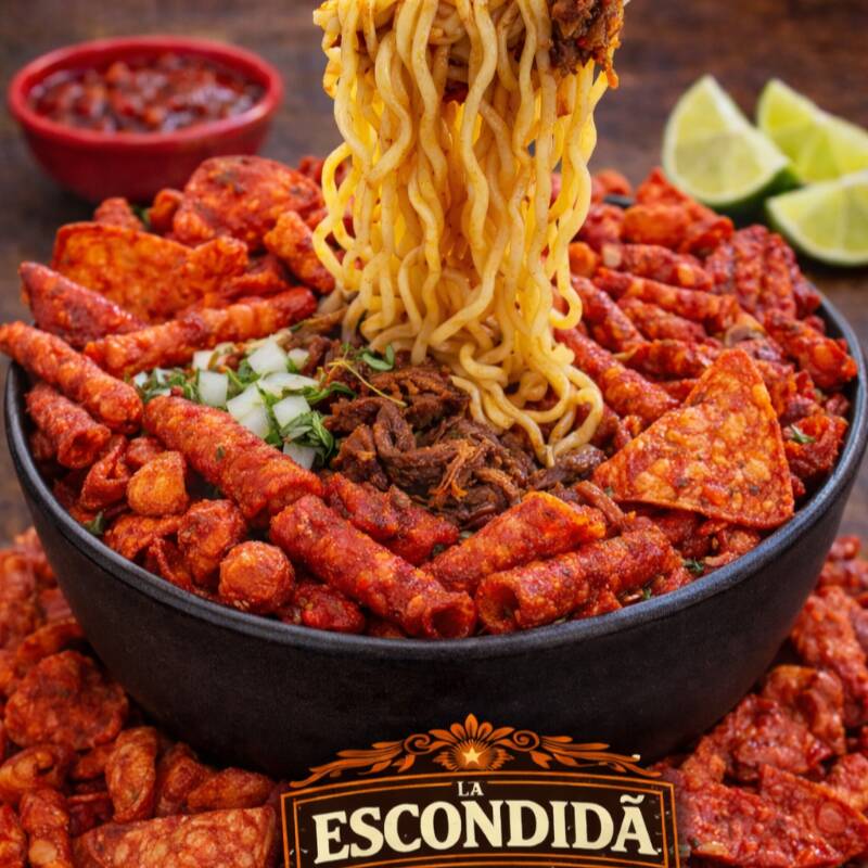 Birriamen preparado con 100 g de ramen y 900 ml de consomé de birria bien calientito, acompañado de una generosa porción de carne de birria jugosa, suave y bien deshebrada, Paketaxo Flaming Hot por encima, queso gratinado que se funde con el caldo, cilantro y cebolla fresca, limón al gusto y salsa roja para un toque extra de picor.