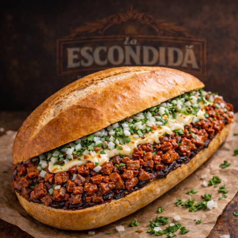 Elaborada con bolillo del día, untado con mayonesa y frijoles refritos, rellena de jugosa carne enchilada de puerco cortado en pequeños cuadros. Lleva queso manchego gratinado en la tapa, cilantro y cebolla fresca. Todo va a la plancha para lograr un pan dorado y crujiente. Se acompaña con limón y salsa al gusto. (PONER EN COMENTARIOS SI LA QUIEREN NATURAL O SIN MAYONESA)