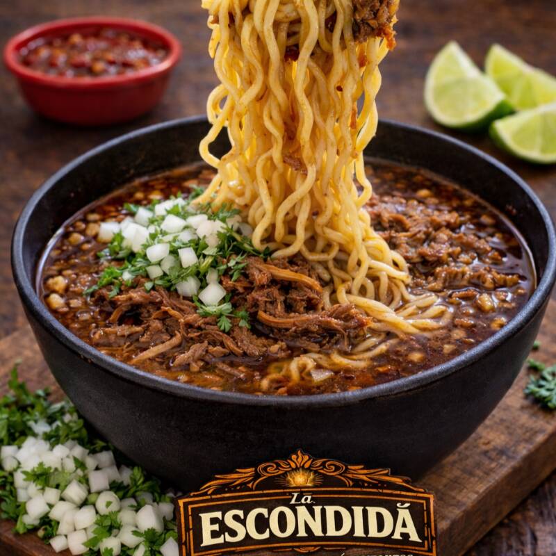 300 ml de caldo de birria bien calientito, intenso y lleno de sabor, con 50 g de ramen perfectamente cocido. Se sirve con cilantro y cebolla fresca, limón y salsa roja para darle ese toque picosito que lo hace irresistible.