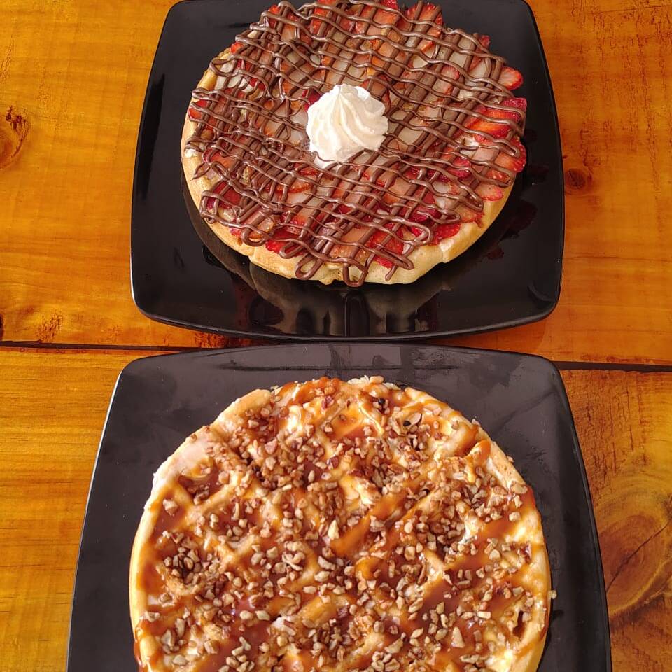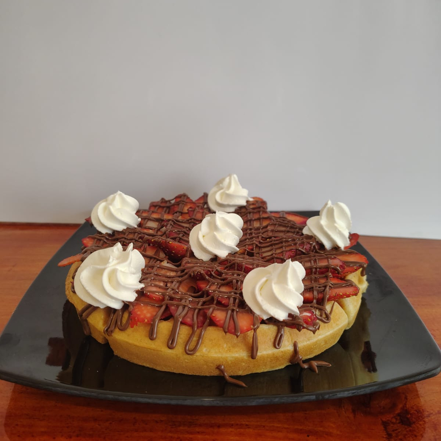 waffle con dos ingredientes a elegir (mermelada de fresa, mermelada de frutos rojos, mermelada de zarzamora, nutella, cajeta, miel, leche condensada, nuez, chispas de chocolate, hershey's liquido, fresa, durazno, platano, piña, jamón de pavo, gouda, philadelphia, parmesano, pepperoni)
