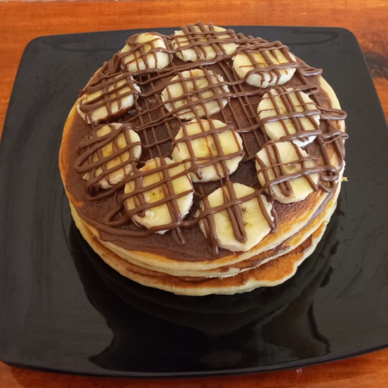 3 piezas de hot cakes con dos ingredientes a elegir (mermelada de fresa, mermelada de frutos rojos, mermelada de zarzamora, nutella, cajeta, miel, leche condensada, nuez, chispas de chocolate, hershey's liquido, fresa, durazno, platano, piña, jamón de pavo, gouda, philadelphia, parmesano, pepperoni)