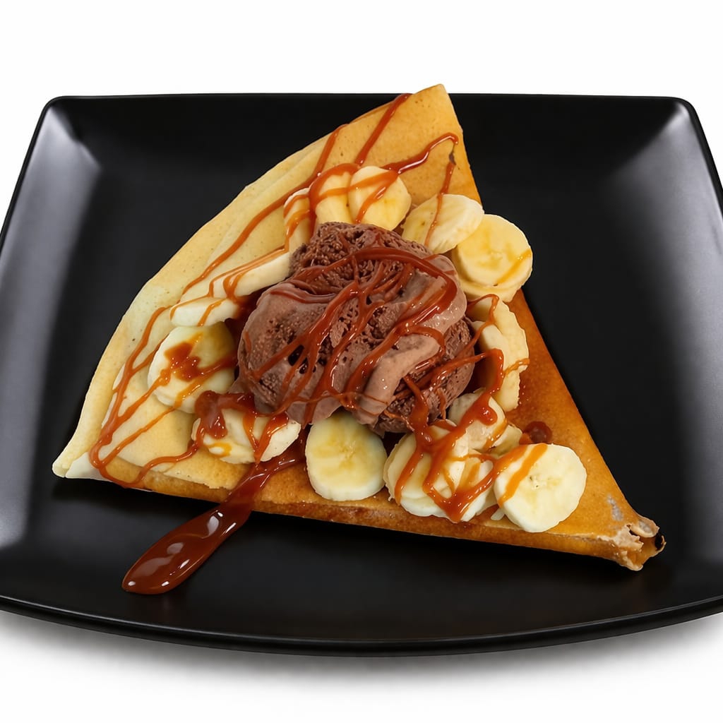 Crepa con Cajeta, Helado a elegir, platano o fresa