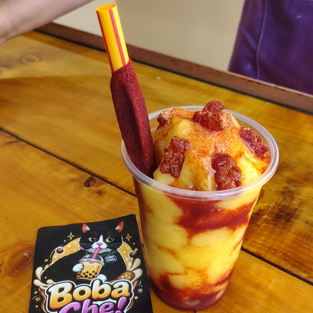 Smoothie de mango natural o preparado con Chamoy, miguelito, varita de tamarindo y gomitas picositas 475ml
