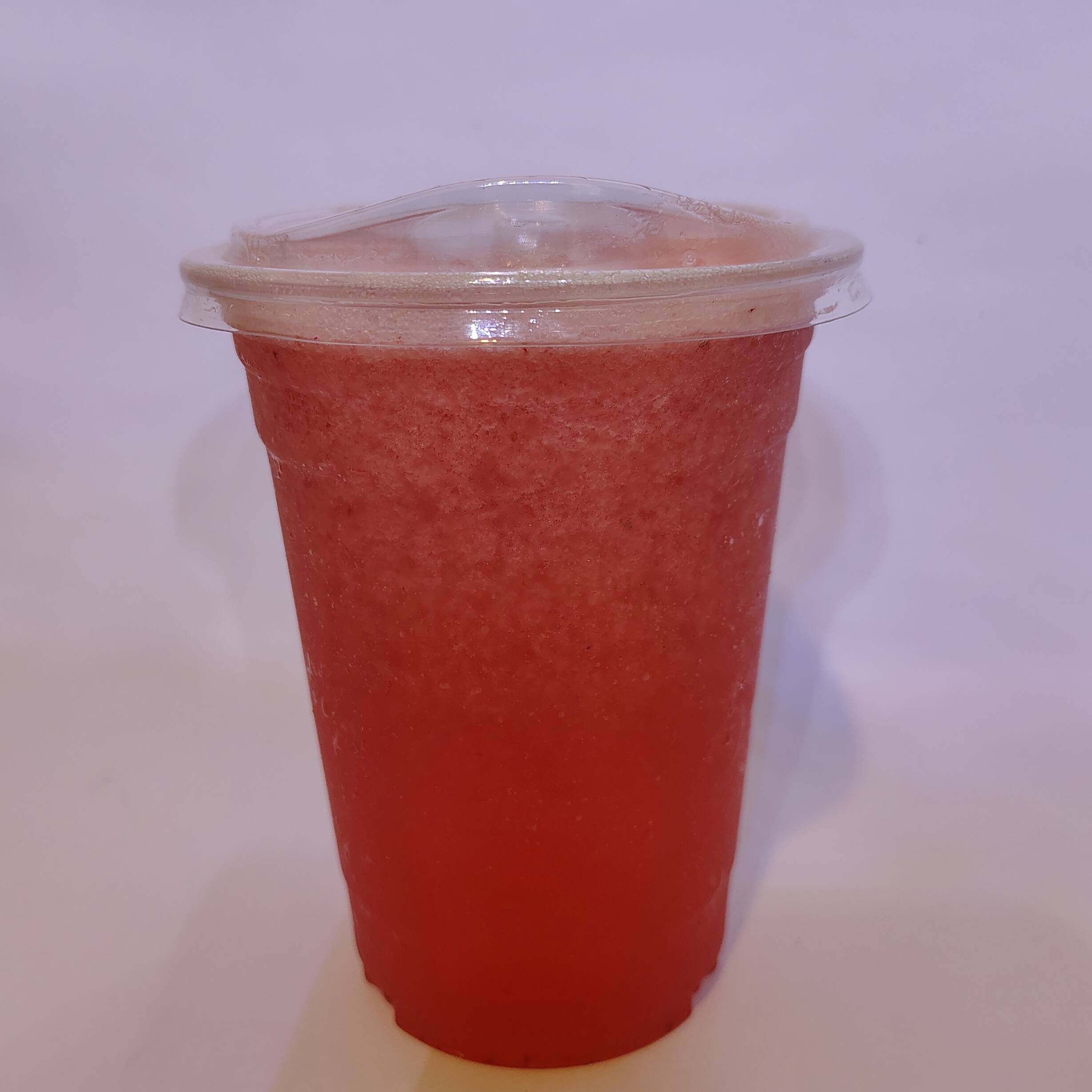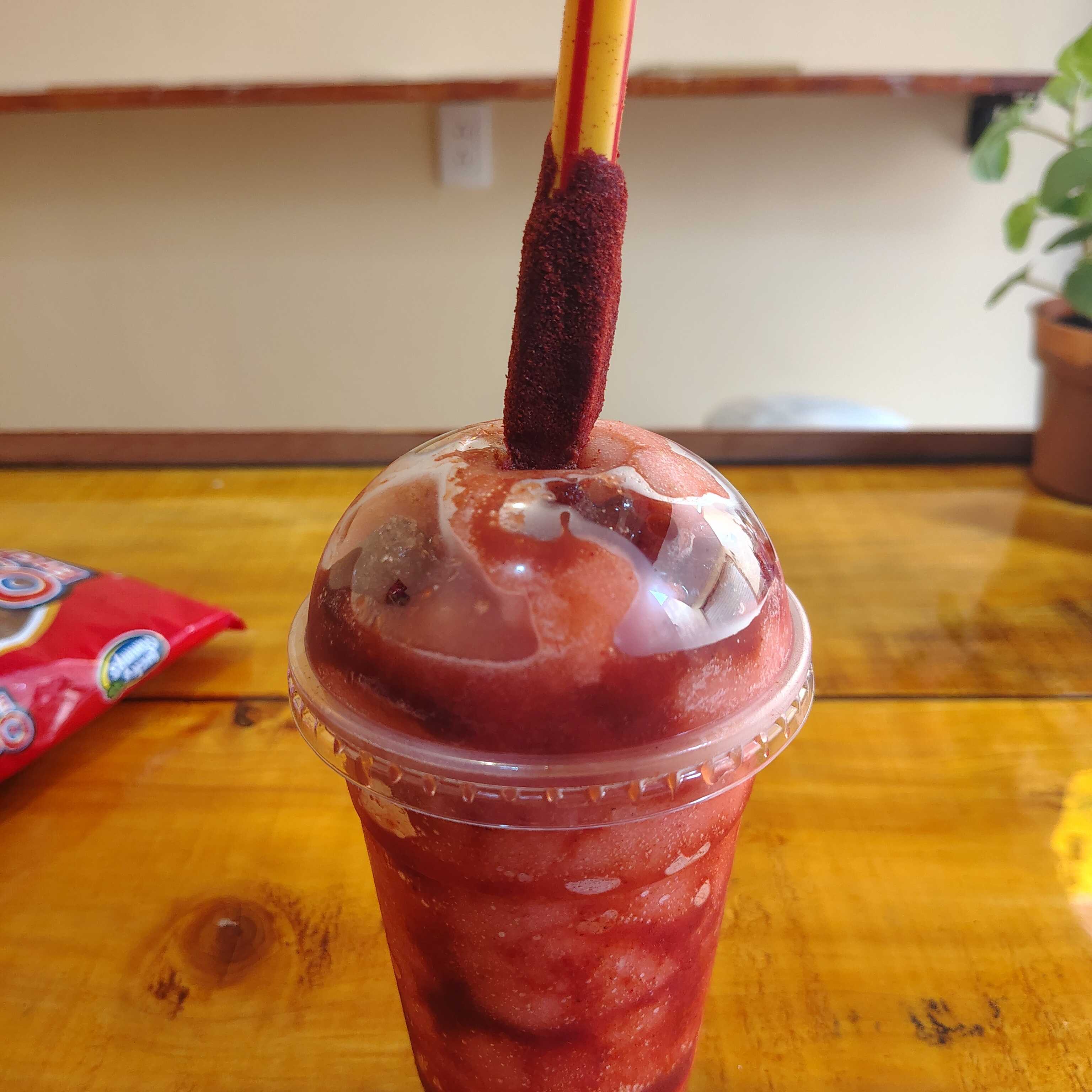 Smoothie sabor fresa limón natural o preparado con chamoy, miguelito, varita de tamarindo y gomitas picositas 475ml
