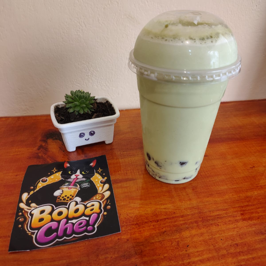Bebida a base de leche deslactosada sabor matcha y perlas de tapioca bañadas en mermelada de fresa casera 475ml