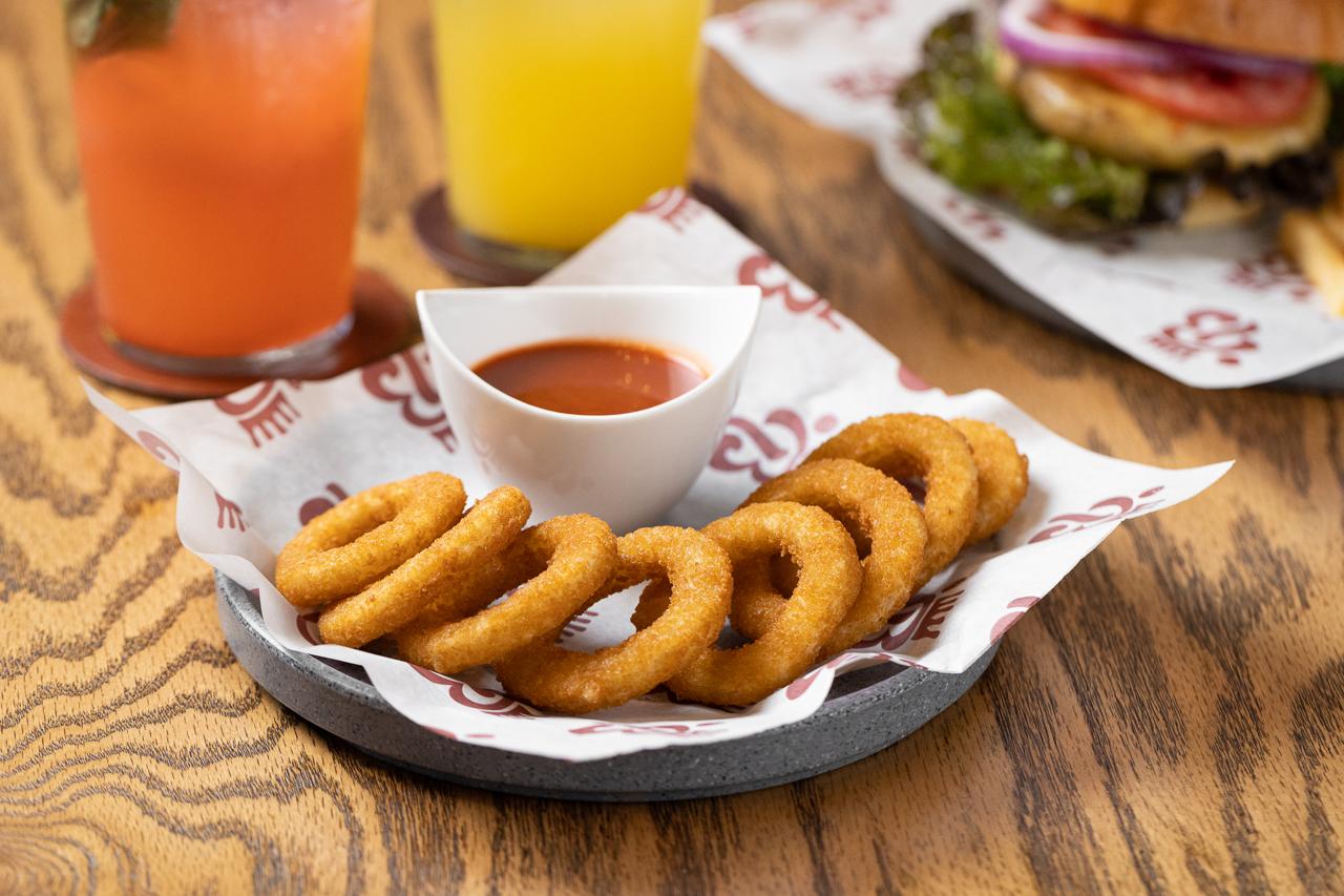 Aros de cebolla blanca empanizadas con dip de búfalo.