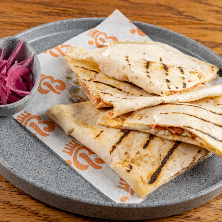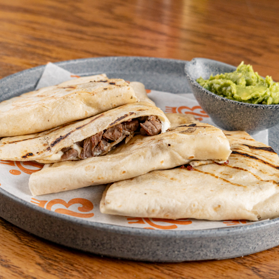 2 piezas de tortilla de harina con arrachera gratinada en queso cremoso.