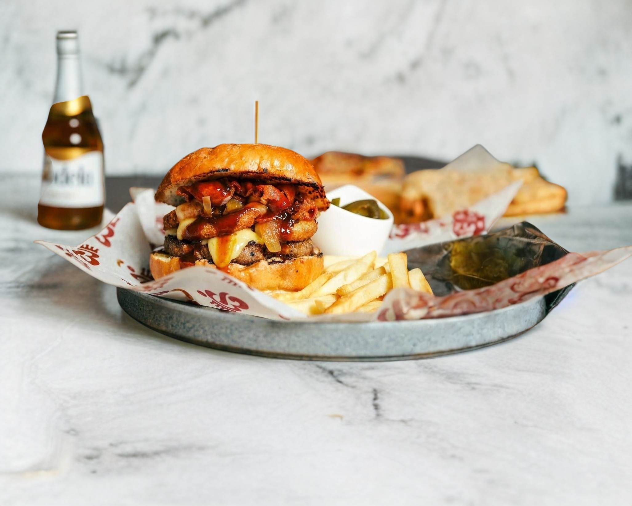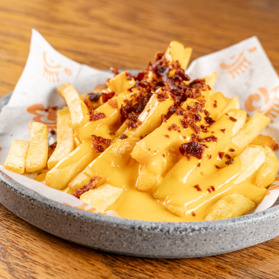 140 Gr de carne en pan brioche con queso, tocino, acompañada con 170gr de papas a la francesa.