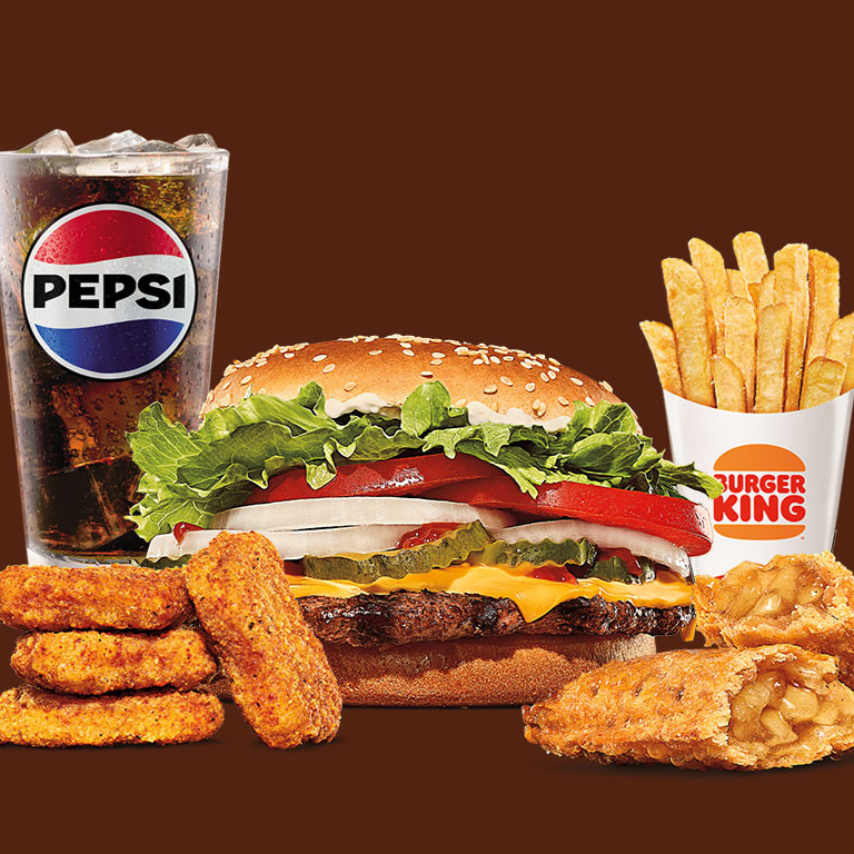 Sabor para compartir en familia: 1 Whopper® con queso + 1 King de Pollo con queso + 2 Whopper Jr con queso + 3 Papas chicas.