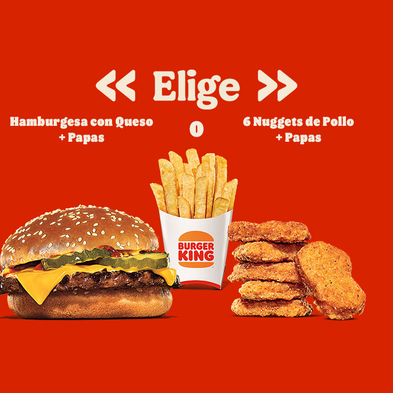 El antojo que todo Rey necesita. Elige entre hamburguesa con queso o 6 nuggets + papas chicas.