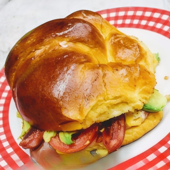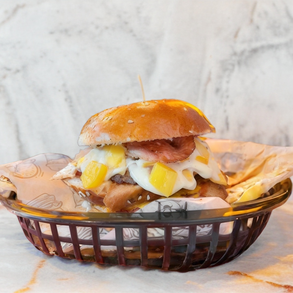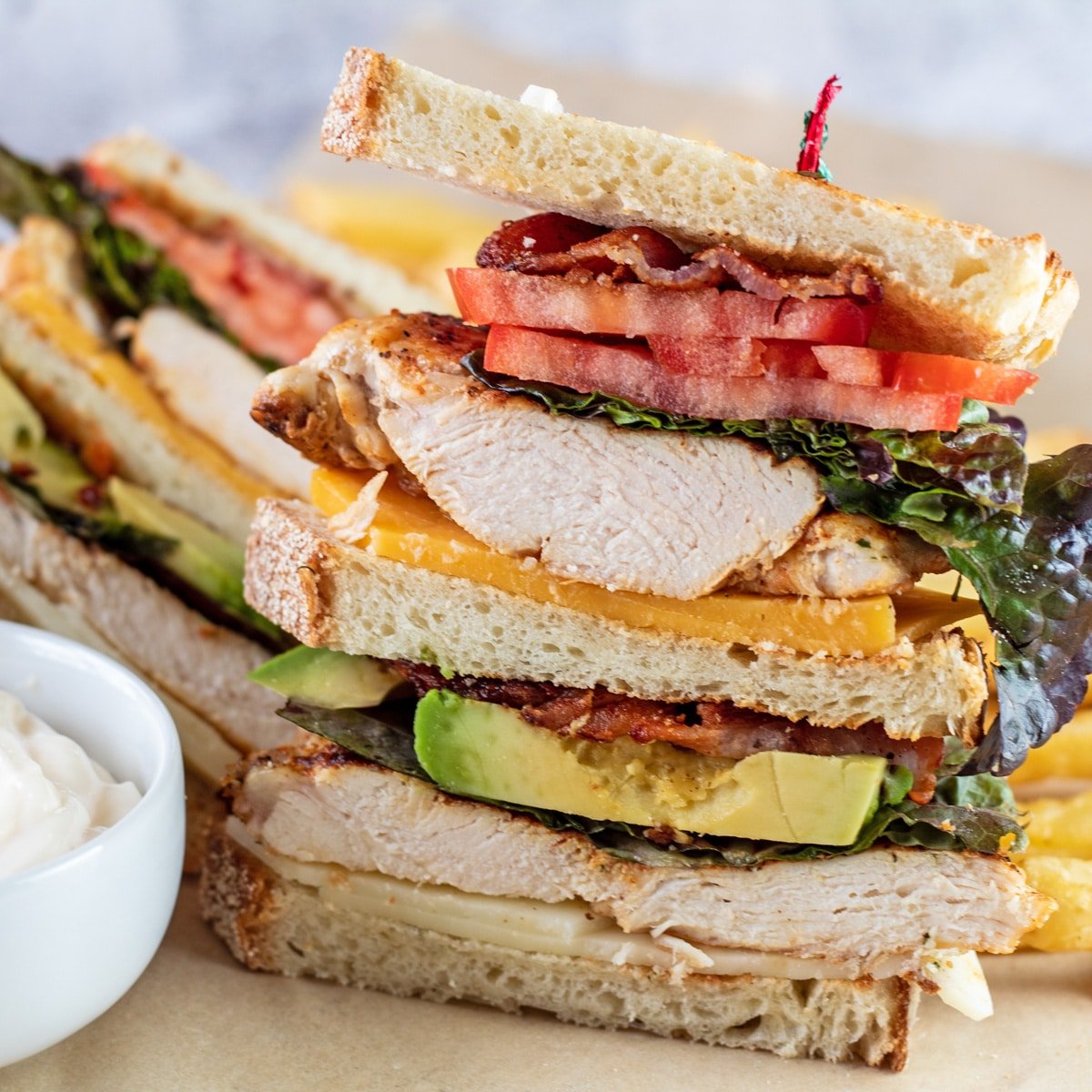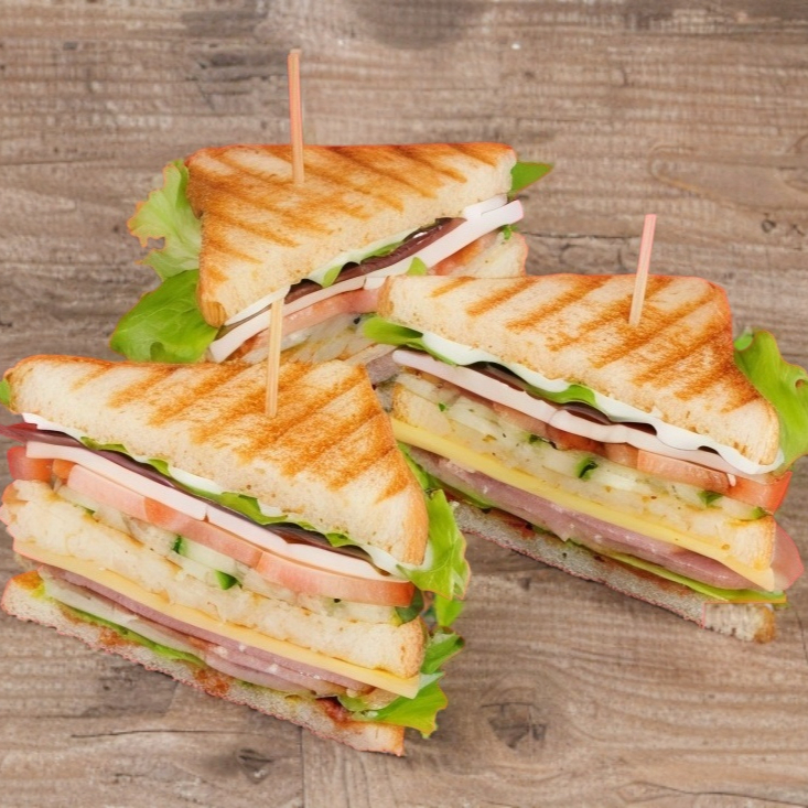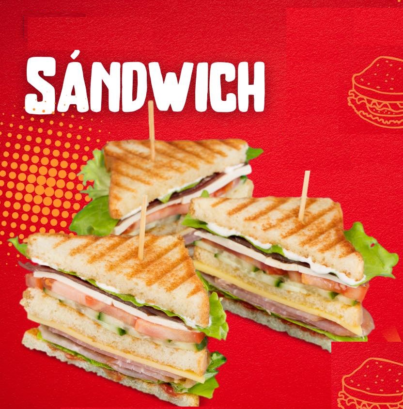 Doble rebanada de jamón, queso americano, queso manchego, salchicha, tocino, aguacate en 2 niveles de pan, acompañado de papas a la francesa.