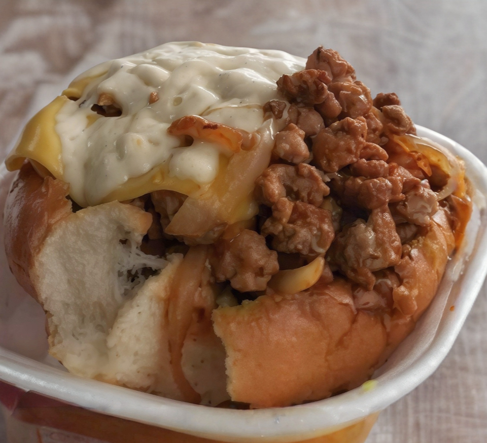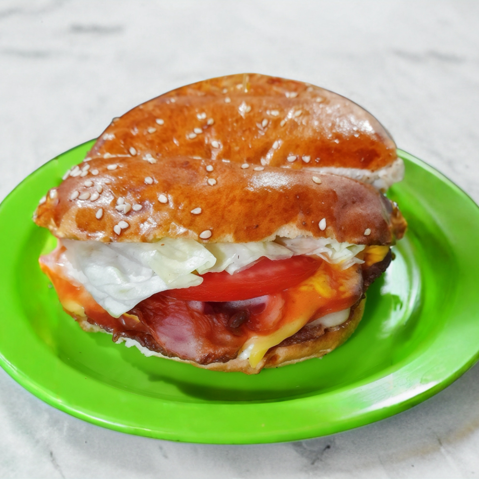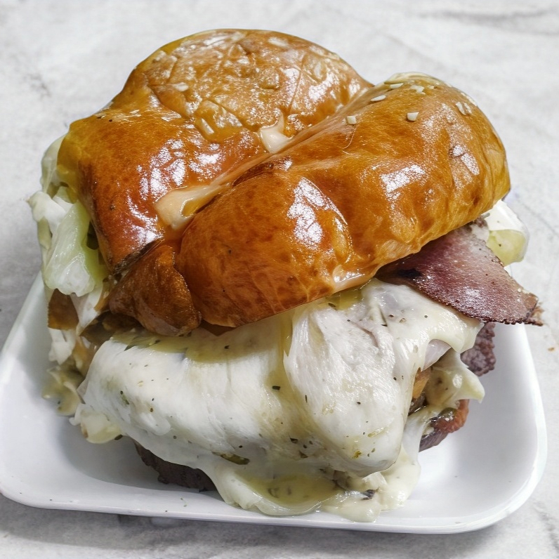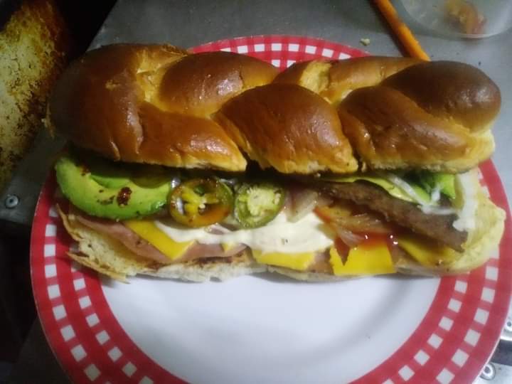 200 gr de carne de res acompañada por guacamole, queso americano y queso Oaxaca fundidos en crujiente bolillo a la plancha