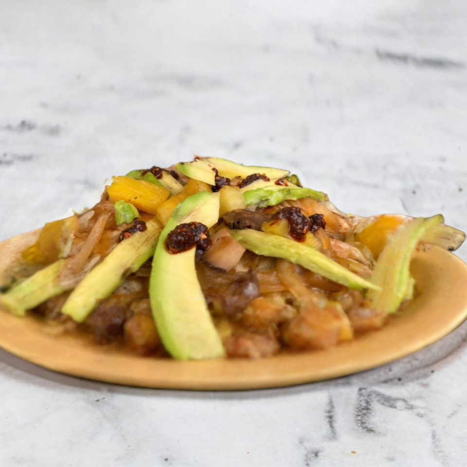 Jamón doble, queso americano, queso oaxaca, salchicha, aguacate, cebolla caramelizada,piña y champiñón