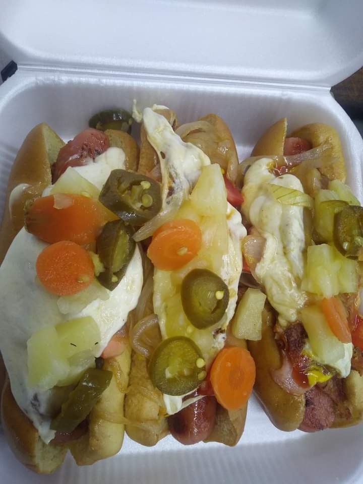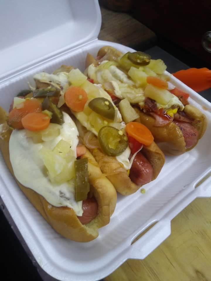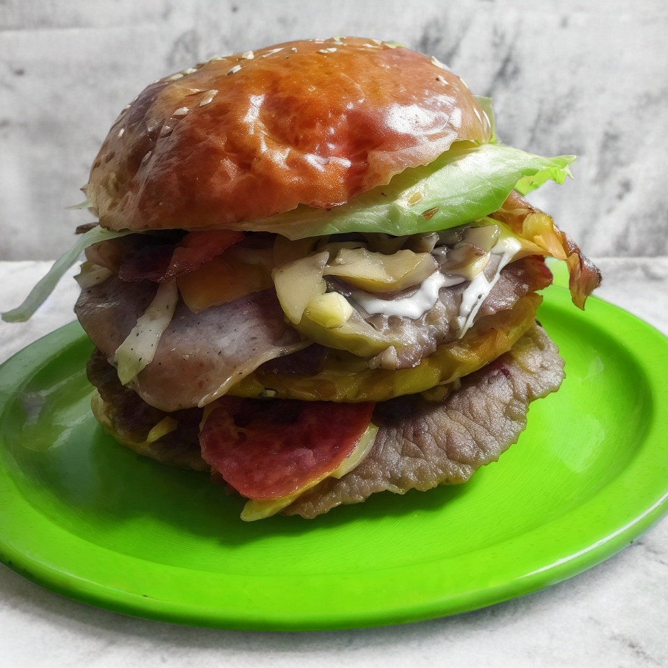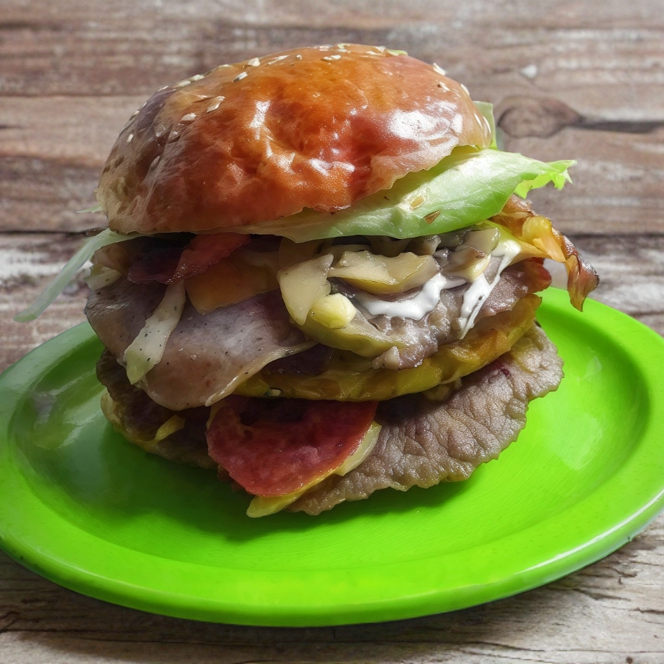 Doble carne, aderezos, vegetales, doble salchicha, jamón, queso americano, queso oaxaca, tocino, piña o champiñones, en 2 niveles de pan.