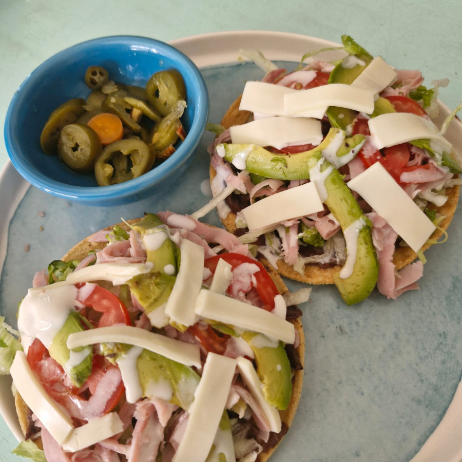 1 tostada de maíz cubierta de frijoles, acompañada de queso manchego, lechuga queso americano, jamon, lechuga, jitomate, aguacate y mayonesa