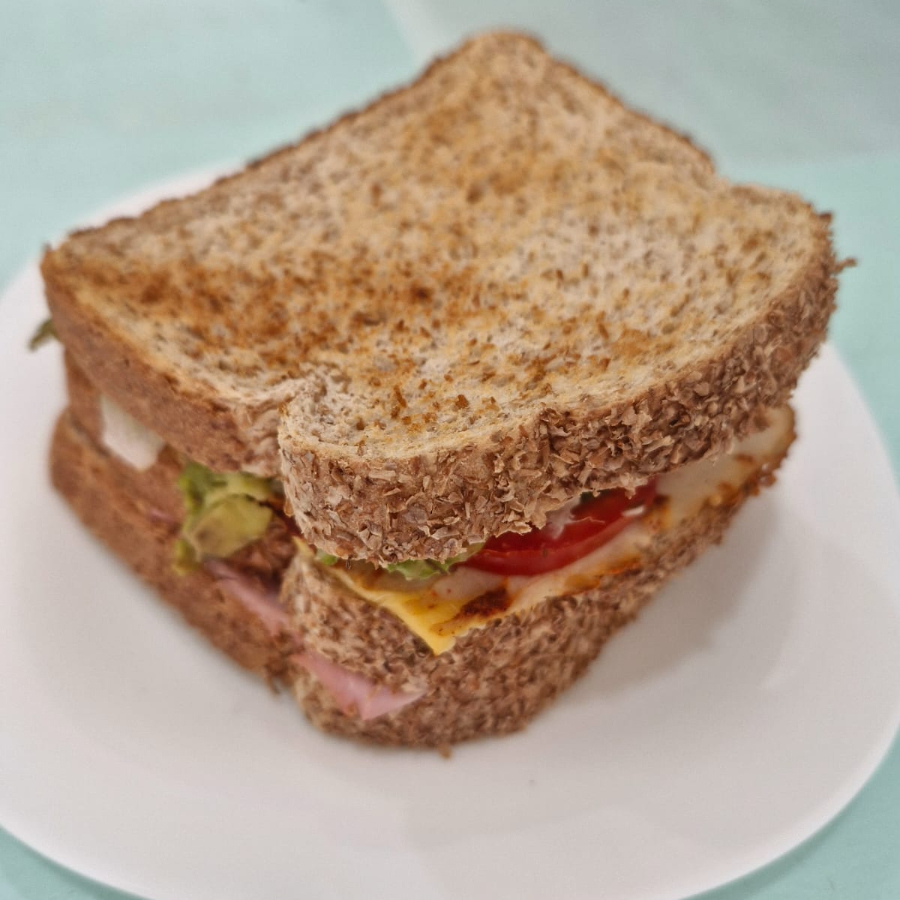 Emparedado de 2 pisos con queso americano, queso manchego, jamón, lomo ranchero, lechuga, jitomate, aguacate y mayonesa