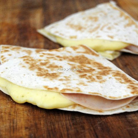 2 tortillas de harina, con queso manchego, queso americano, jamon, lomo ranchero, lechuga, jitomate, aguacate y mayonesa