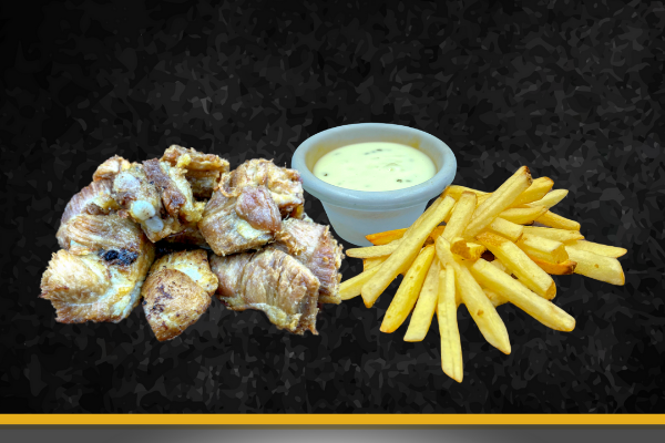 Costilla de puerco bañada en salsa de tu preferencia, acompañadas de 85g de papas a la francesa y aderezo ranch (1oz). Orden de 360gr.