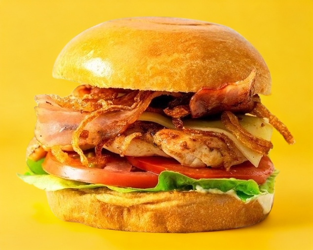 Pan, una pechuga de pollo a la plancha, queso amarillo, jamón, aderezos, lechuga, jitomate, cebolla, picante.