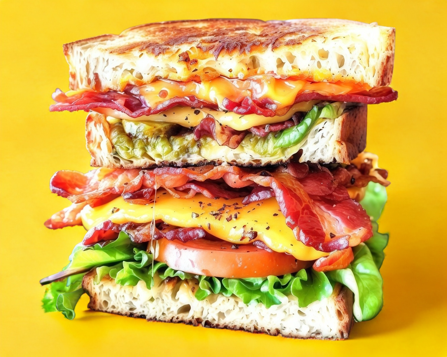 Tres panes de caja, pechuga de pollo a la plancha, tocino, queso amarillo, jamón, aderezos, lechuga, jitomate, cebolla, picante.