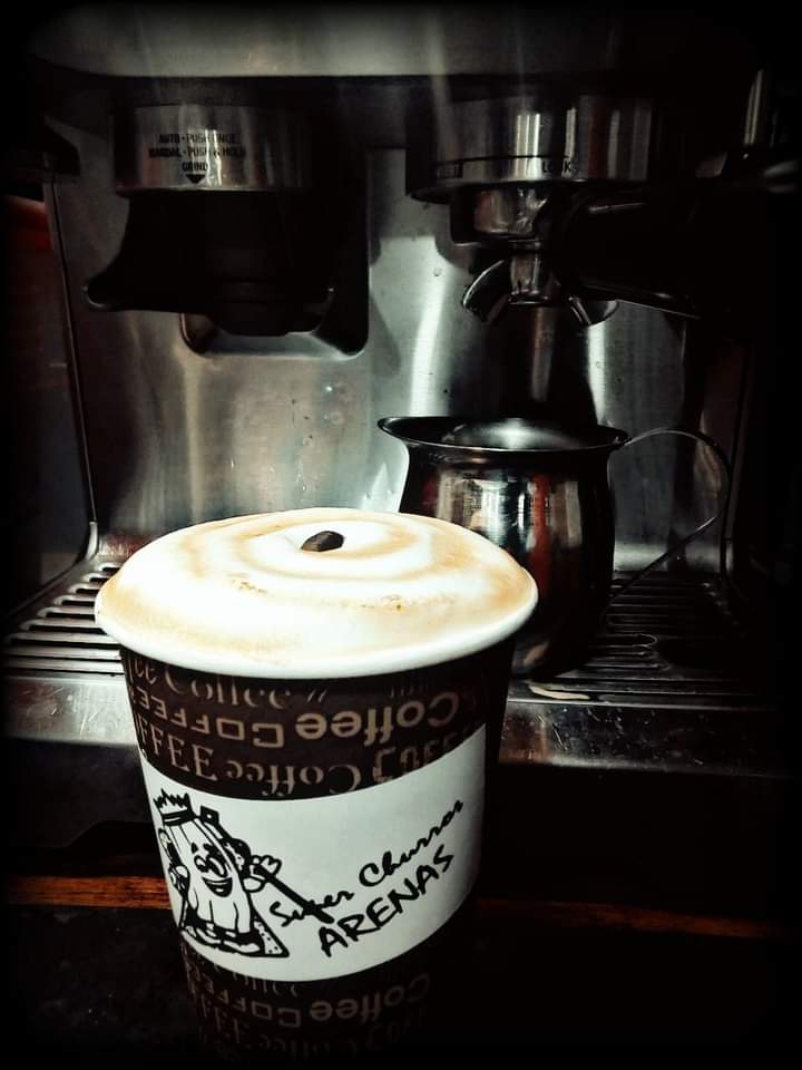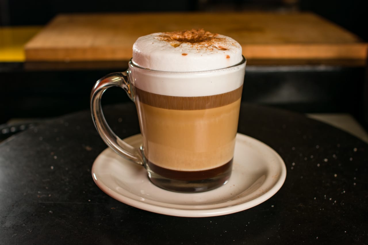 leche caliente con un shot de café espresso, copeteado con espuma espolvoreada con canela