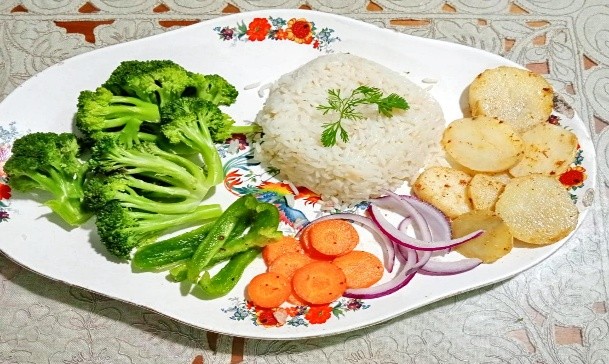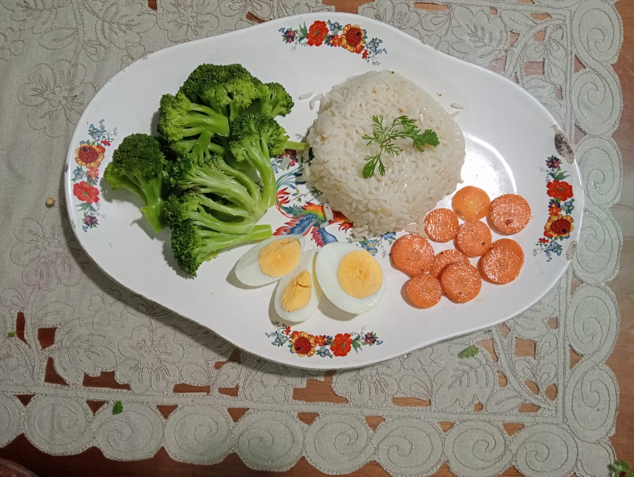 Brocoli, zanahoria, arroz blanco, pimiento verde, papa, cebolla morada.