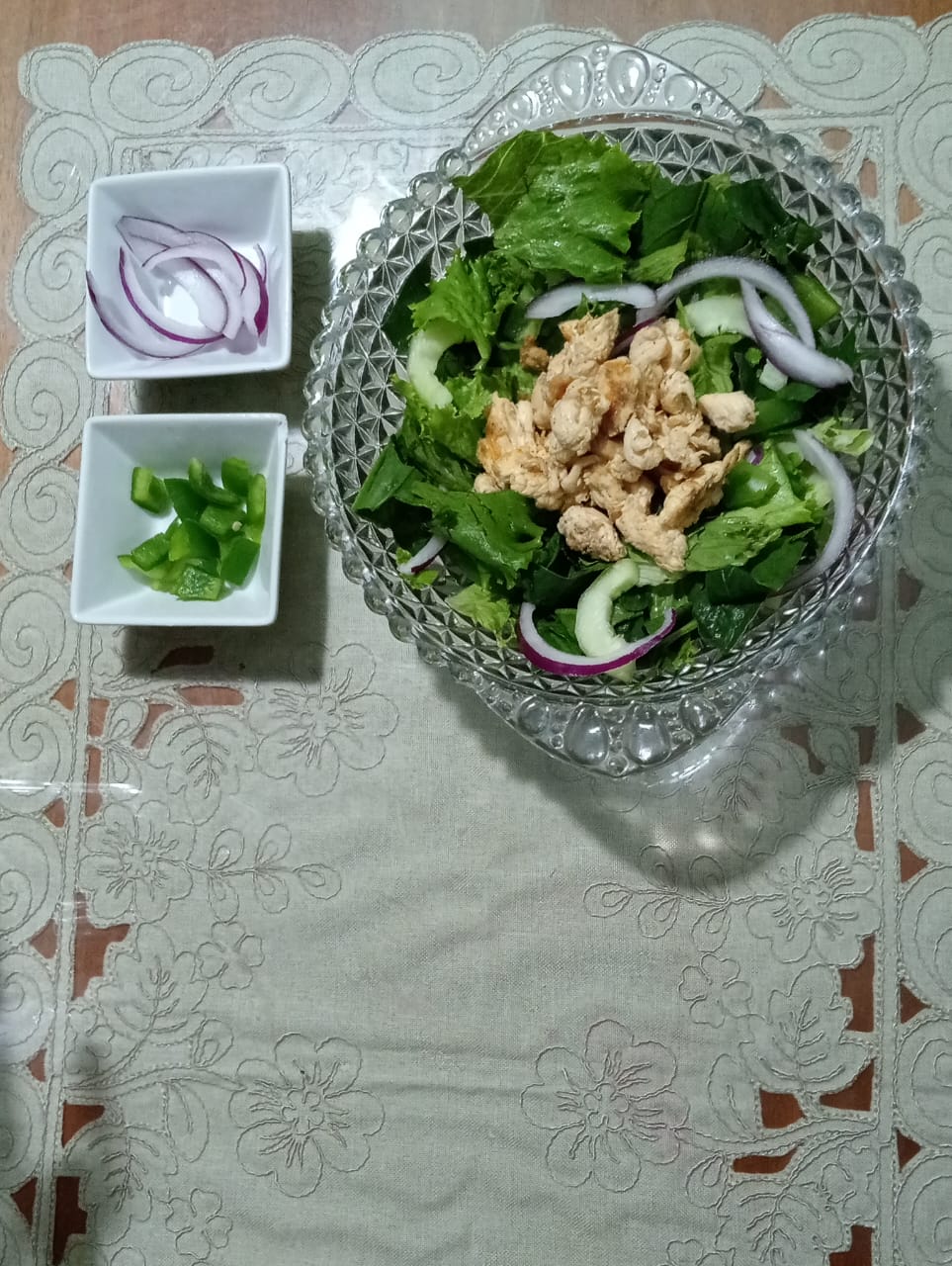 Lechuga , espinaca, pepino, cebolla morada, pollo asado.