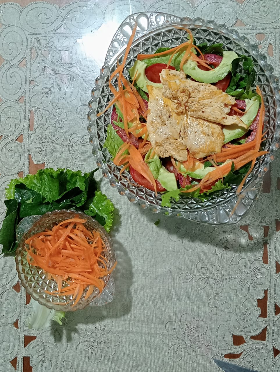 Lechuga, espinaca, jitomate, aguacate, zanahoria y pollo.