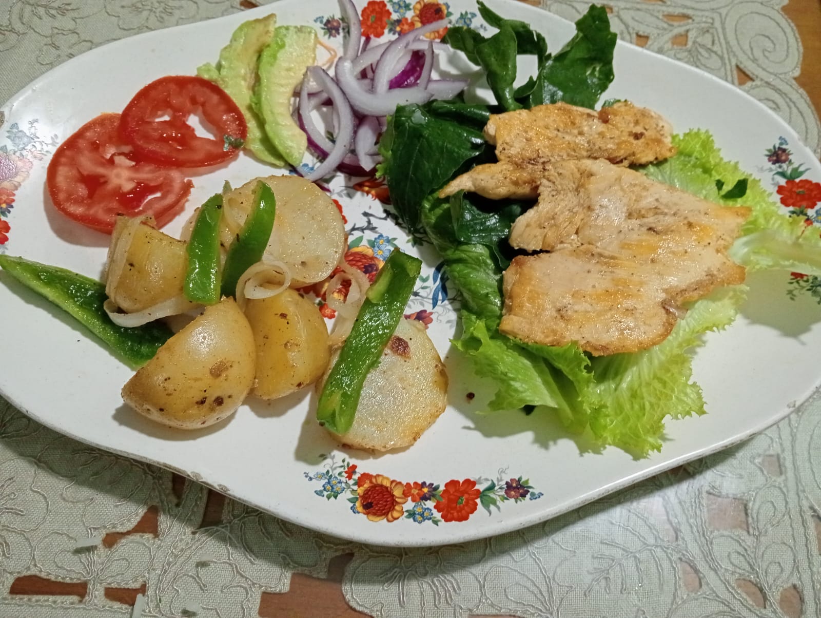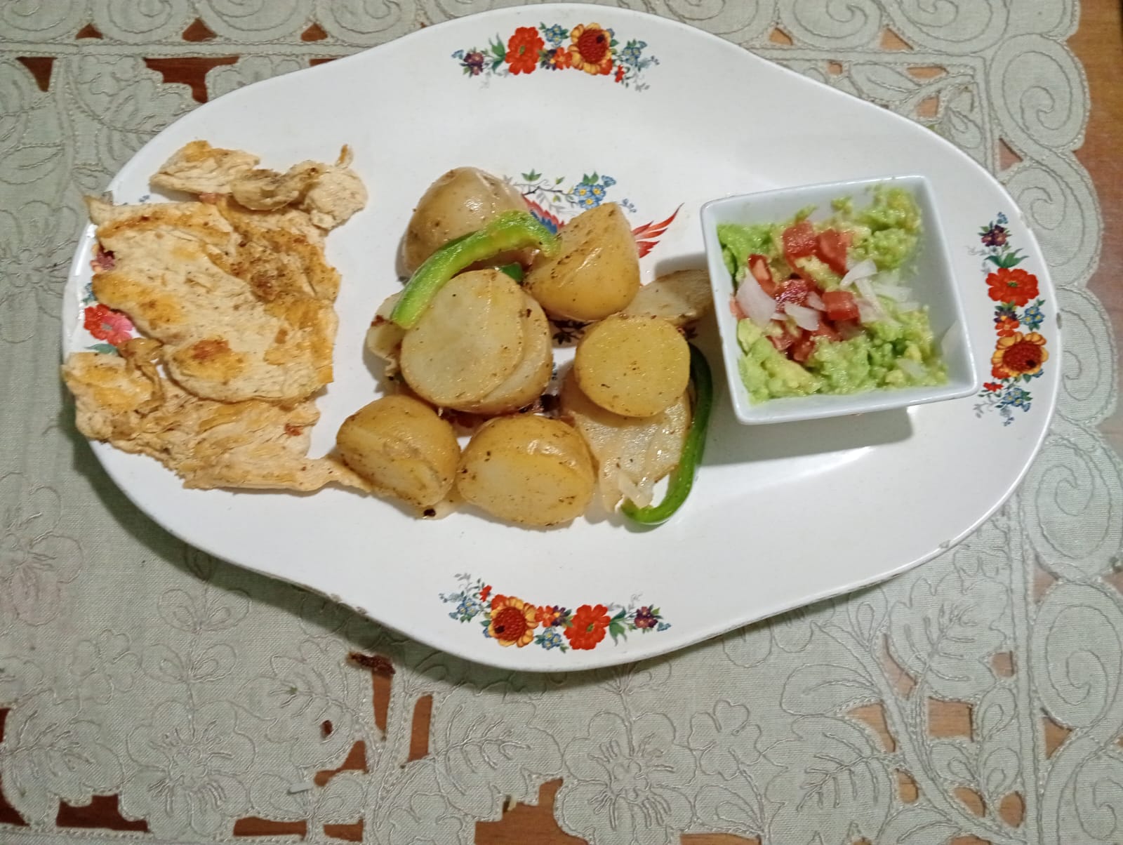Pechuga asado, jitomate, aguacate, papas y cebolla morada, espinaca y limón.